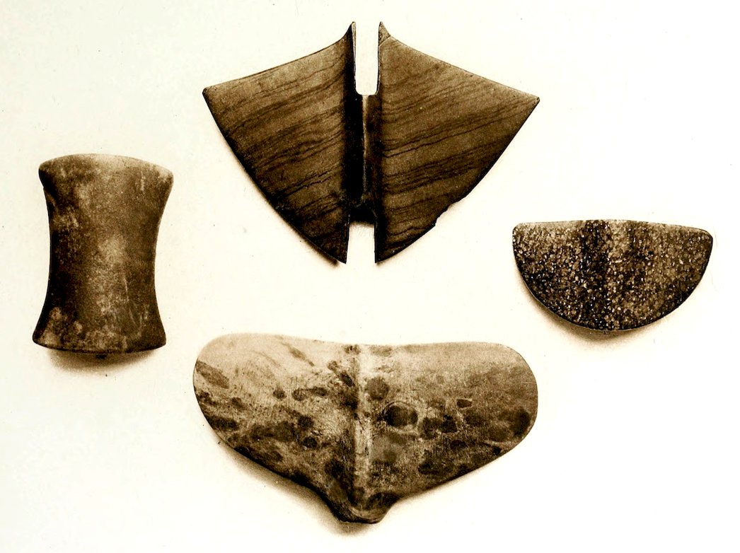 Fig. 388. (S. 1–4.) Discoidal stones from Kentucky; valley of the Cumberland River. The central one is of slate. B. H. Young’s collection, Louisville, Kentucky.