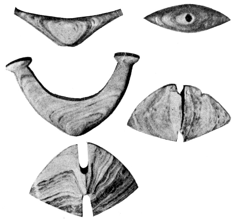 Fig. 389 shows four beautiful specimens from Tennessee, Andover collection. These are not merely depressed in the centre, but have a high, fluted rim, the centre being cut out, and the surfaces on the inside of the rim either sloping toward a second depression in the centre, or made flat. All are highly polished, and of Tennessee marble or quartz. The colors vary from rich brown to spotted, with yellow predominating. Fig. 388, from Colonel Young’s magnificent collection, illustrates nine bicaves of various sizes and materials—the 447black slate one in the centre, flanked by those of beautifully mottled quartz on either side, and one of pure white quartz to the right of the centre.