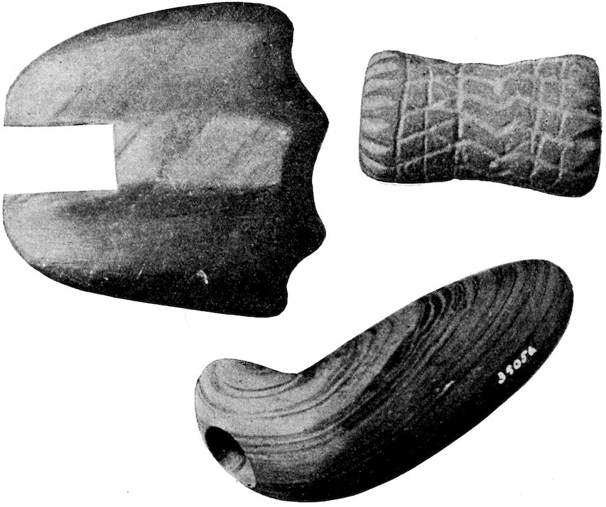 Not only are there tubular pipes, but there are also tubular forms which apparently are not pipes. I show numbers of these in Figs. 394 and 398. Fig. 394 illustrates a number of steatite beads from the collection of H. K. Deisher, Kutztown, Pennsylvania.