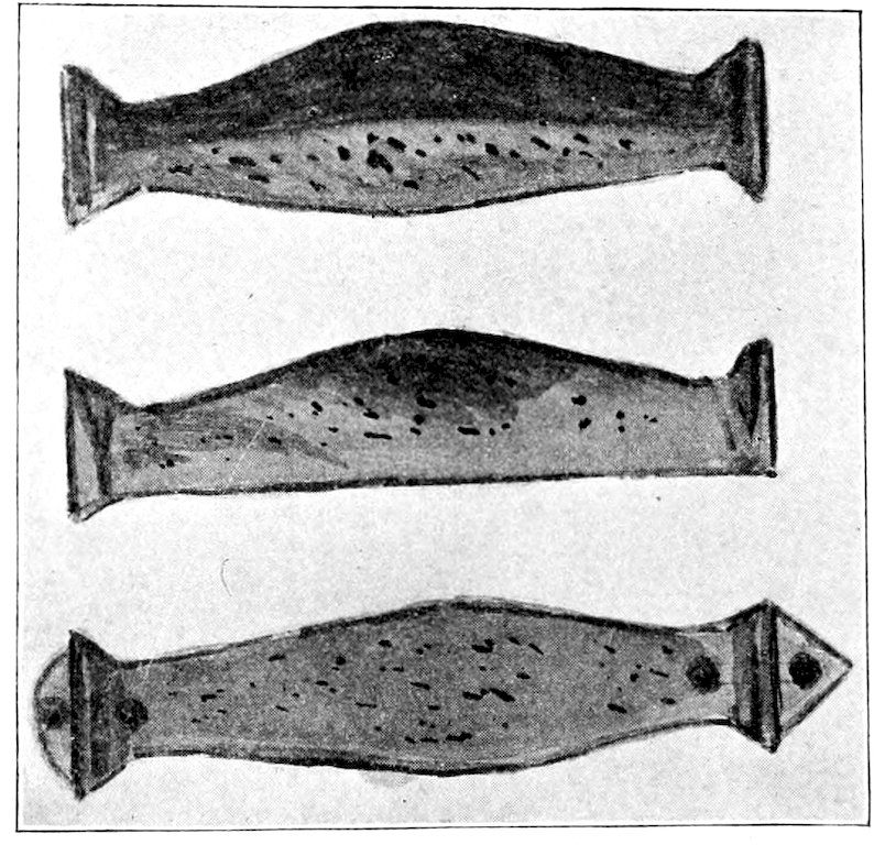 Regarding the ornamental rings such as are shown in Fig. 385 from Kentucky, these were finger-rings. Sometimes large ones are worn as bracelets, but most bracelets were made of copper or shell.