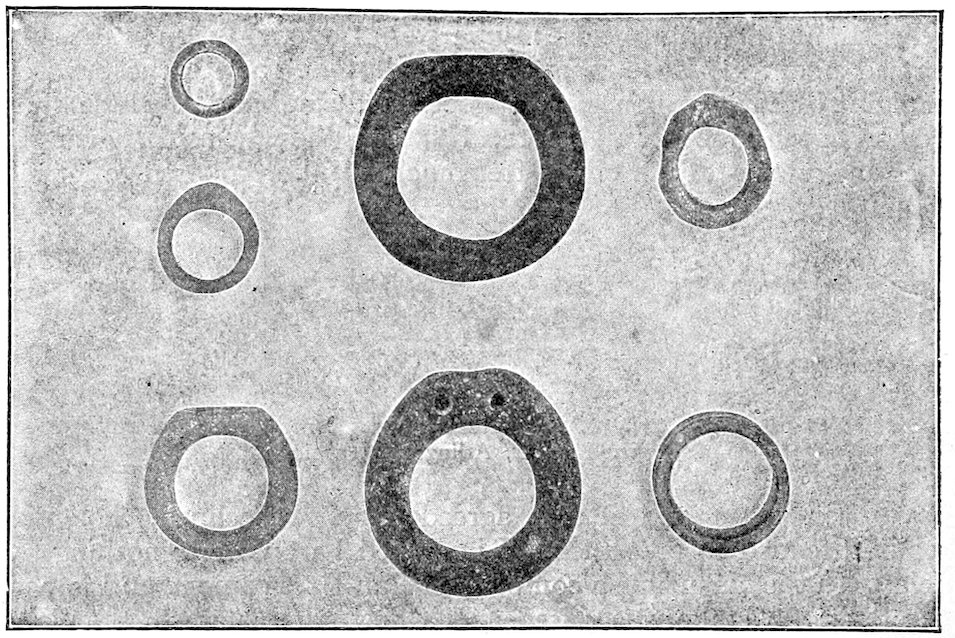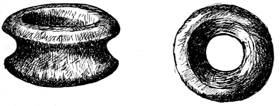 The rings with concave sides such as Fig. 384 were probably made use of in ceremonies concerning the nature of which we are ignorant.