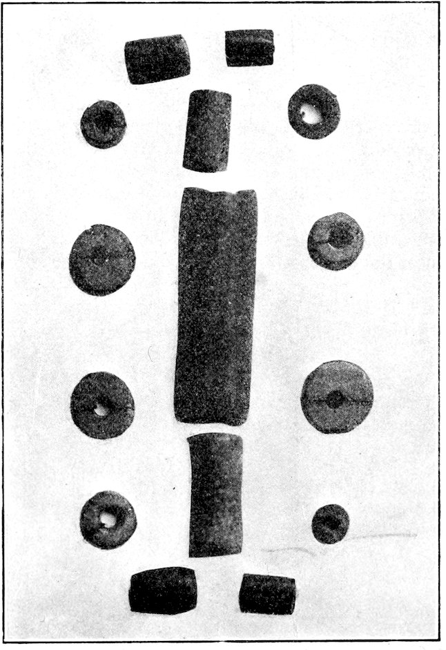 In Fig. 396 are seven from the Andover collection. In the lower left-hand corner is the short, small tube or large bead, with a curious depression, the purpose of which is unknown. In Mr. Deisher’s specimen, Fig. 395, the depression is longer and the groove extends from end to end.