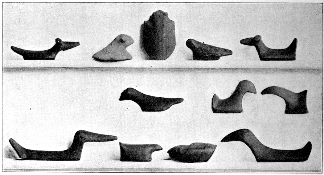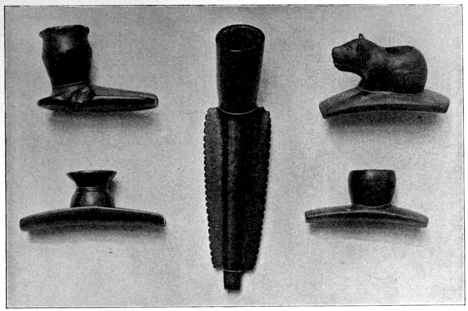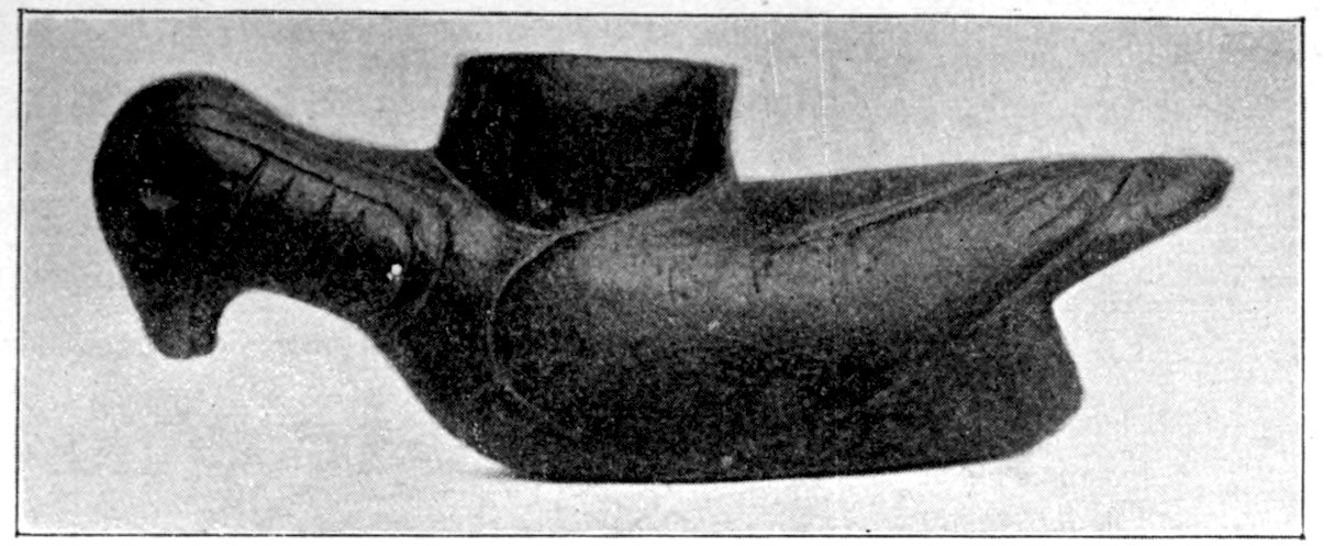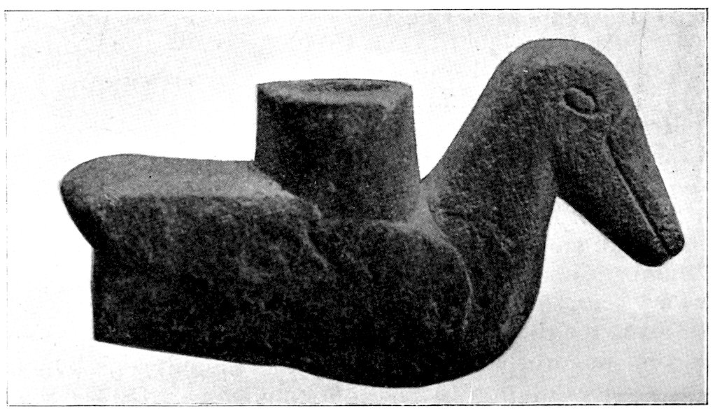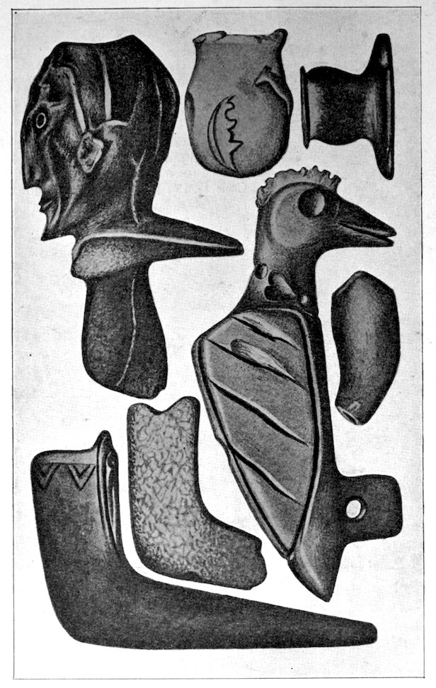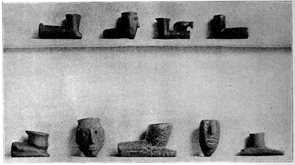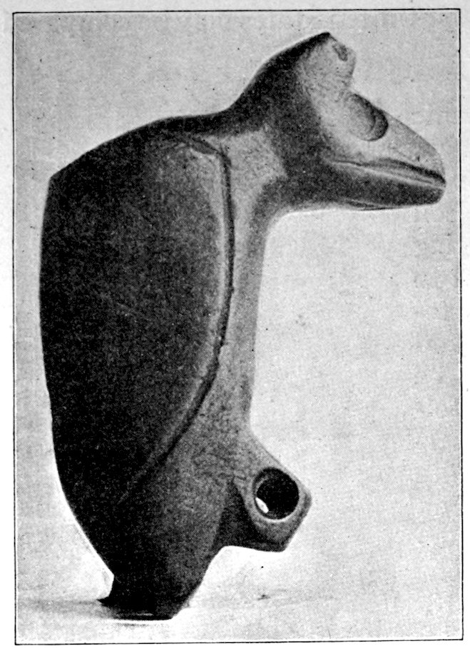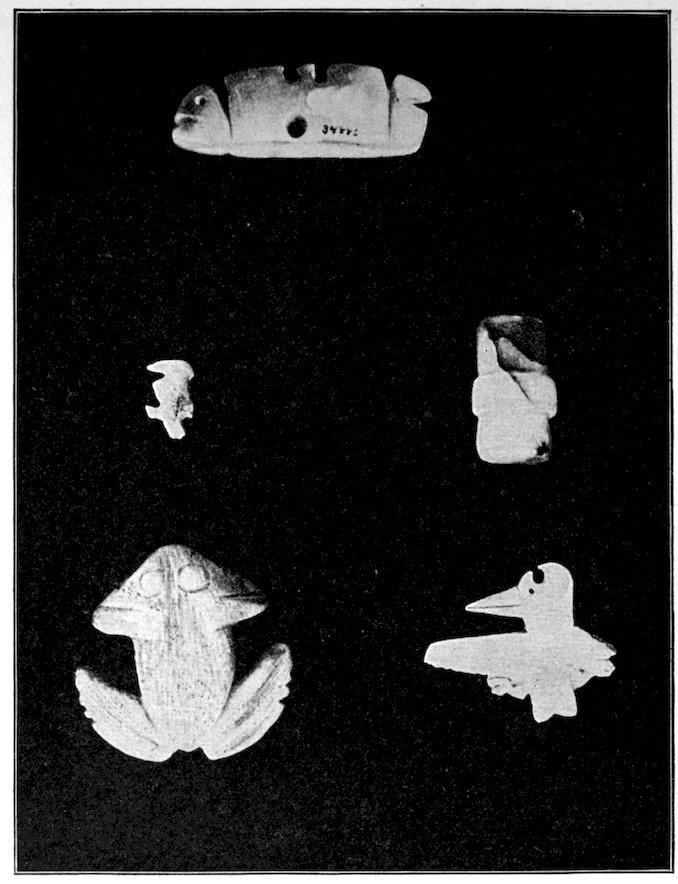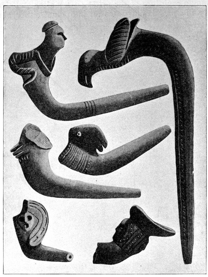 It is significant that the Plains tribes and all the natives who did not construct mounds or earthworks, natives that had not reached the stage of barbarism but were still savages, made no effigies of consequence. The effigies carved in catlinite, and observed among tribes west of the Mississippi during the historic period, seem to have been inspired by a knowledge of the superior arts of the white people. We find that while the roving tribes of the Plains painted various battle and hunting scenes on their tents and shields, yet they were inferior in art as compared with the Pueblo, the Cliff-Dweller, or the Mound-Building peoples. It is also significant, and I shall speak of it at greater length in my Conclusions, that the native American was so little influenced in his art by some life-forms. I have never seen an effigy of a mountain, a tree, a plant, or a flower. The modern Ojibwa Indians design flowers in their bead-work. The ancient Ojibwa did not. The native American did not seem to have been impressed by plant-life or inanimate 4objects. Occasionally, he scratched a trail or a tipi on an ornament, and some of the pictographs in various portions of the United States show wigwams, trails, etc. But while there are numerous examples of carvings in stone, shell, and bone of animals, birds, fish, and reptile life, we search in vain for carvings of the other things I have mentioned. The highest art is found where the largest villages, or the most numerous mounds or cliff-houses, were located. In small mound groups, or areas where the population was not sedentary, the art is very crude. Throughout the areas where the culture is highest, notably Alabama, Georgia, Wisconsin, Tennessee, Arkansas, Missouri, Ohio, and Illinois, we find these large mound groups referred to, all of which proves that the people lived long enough in one place to develop an art.