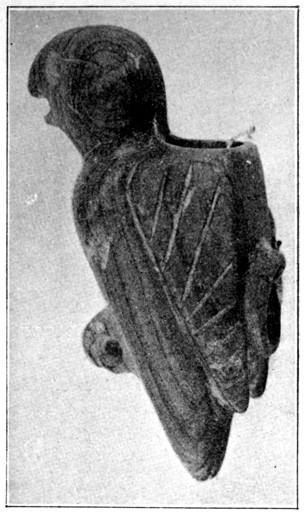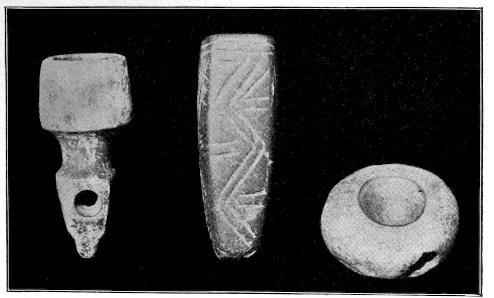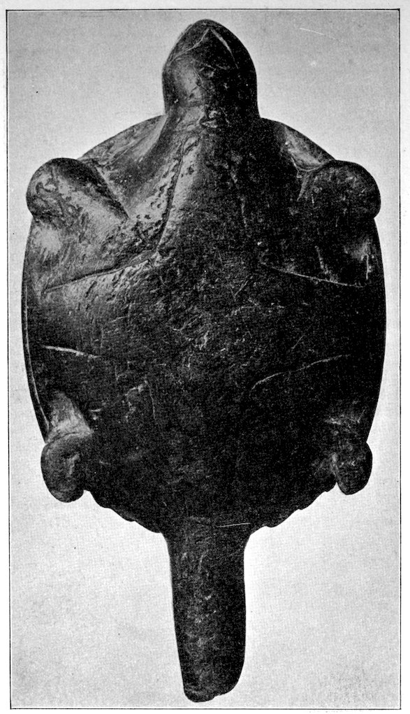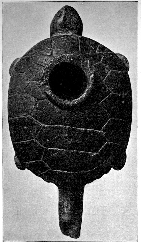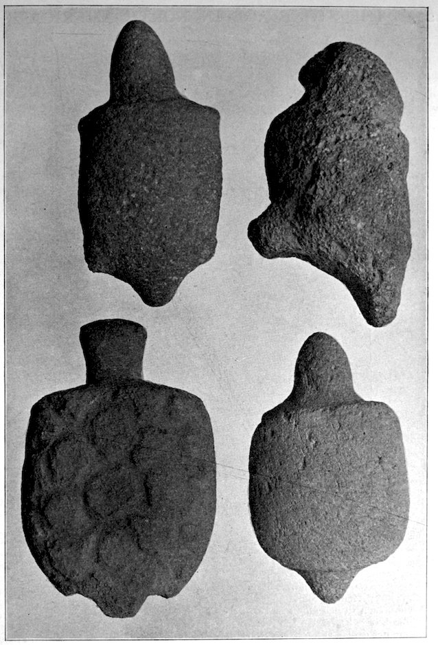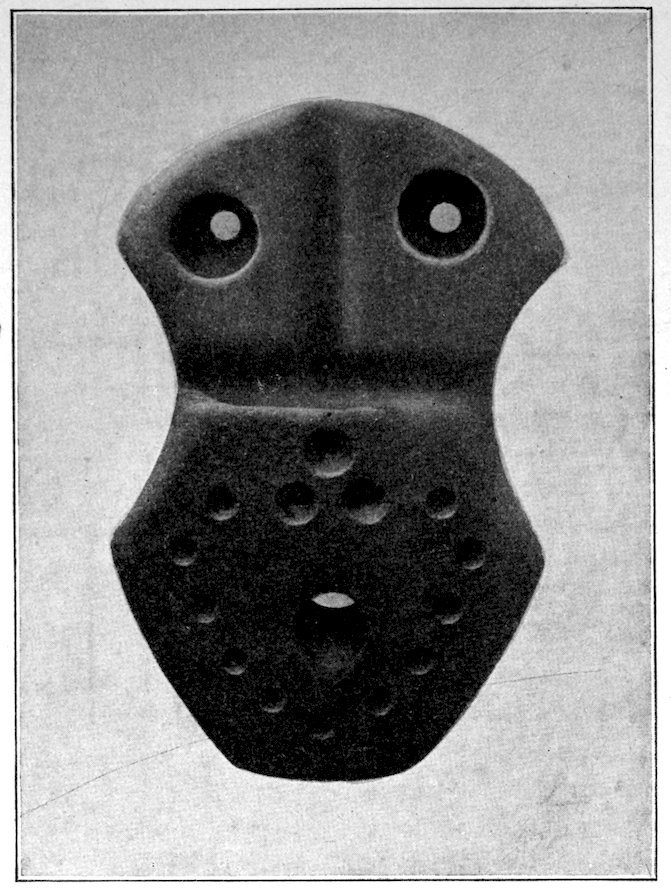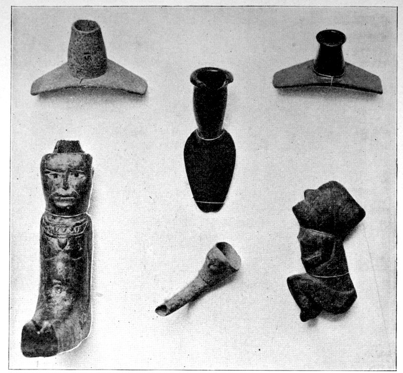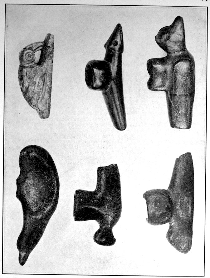 It is significant that the Plains tribes and all the natives who did not construct mounds or earthworks, natives that had not reached the stage of barbarism but were still savages, made no effigies of consequence. The effigies carved in catlinite, and observed among tribes west of the Mississippi during the historic period, seem to have been inspired by a knowledge of the superior arts of the white people. We find that while the roving tribes of the Plains painted various battle and hunting scenes on their tents and shields, yet they were inferior in art as compared with the Pueblo, the Cliff-Dweller, or the Mound-Building peoples. It is also significant, and I shall speak of it at greater length in my Conclusions, that the native American was so little influenced in his art by some life-forms. I have never seen an effigy of a mountain, a tree, a plant, or a flower. The modern Ojibwa Indians design flowers in their bead-work. The ancient Ojibwa did not. The native American did not seem to have been impressed by plant-life or inanimate 4objects. Occasionally, he scratched a trail or a tipi on an ornament, and some of the pictographs in various portions of the United States show wigwams, trails, etc. But while there are numerous examples of carvings in stone, shell, and bone of animals, birds, fish, and reptile life, we search in vain for carvings of the other things I have mentioned. The highest art is found where the largest villages, or the most numerous mounds or cliff-houses, were located. In small mound groups, or areas where the population was not sedentary, the art is very crude. Throughout the areas where the culture is highest, notably Alabama, Georgia, Wisconsin, Tennessee, Arkansas, Missouri, Ohio, and Illinois, we find these large mound groups referred to, all of which proves that the people lived long enough in one place to develop an art.