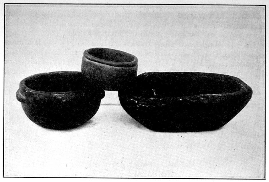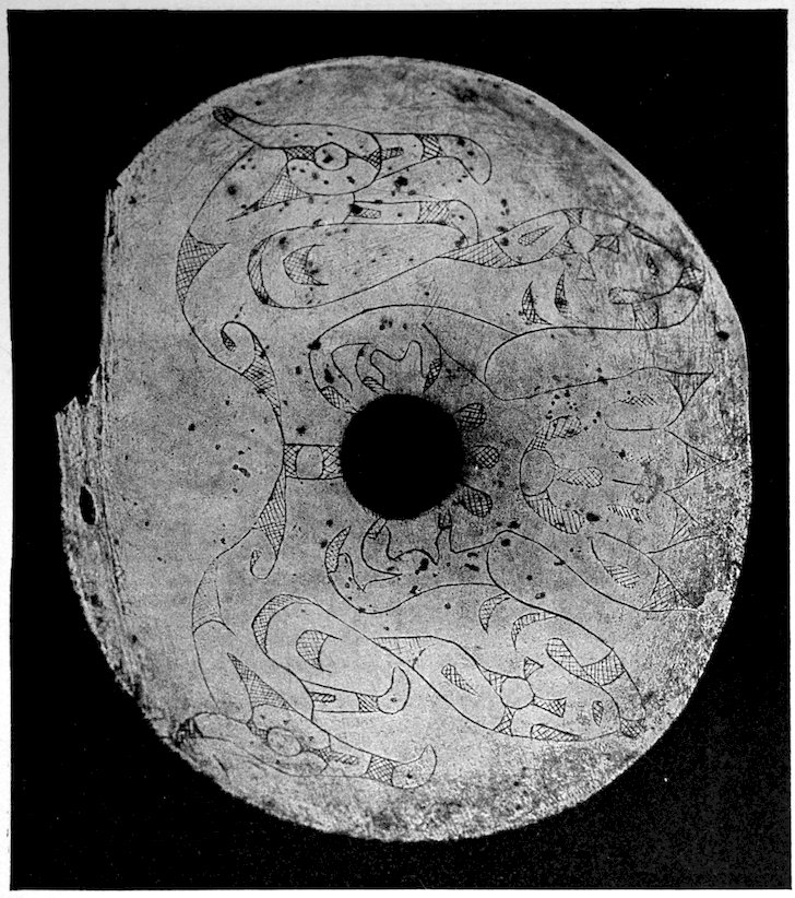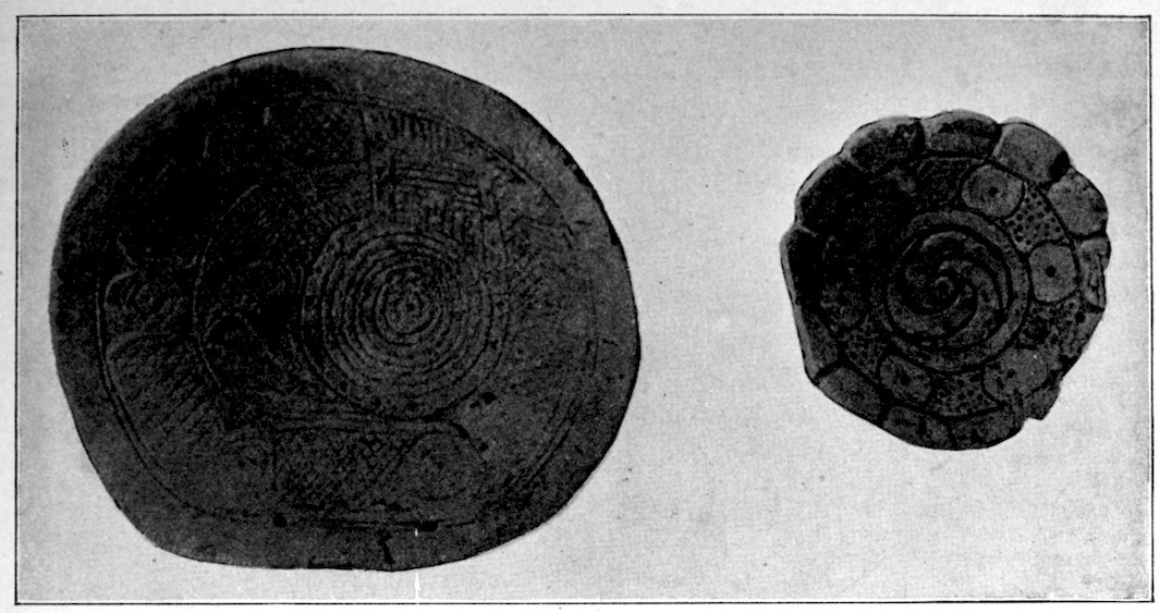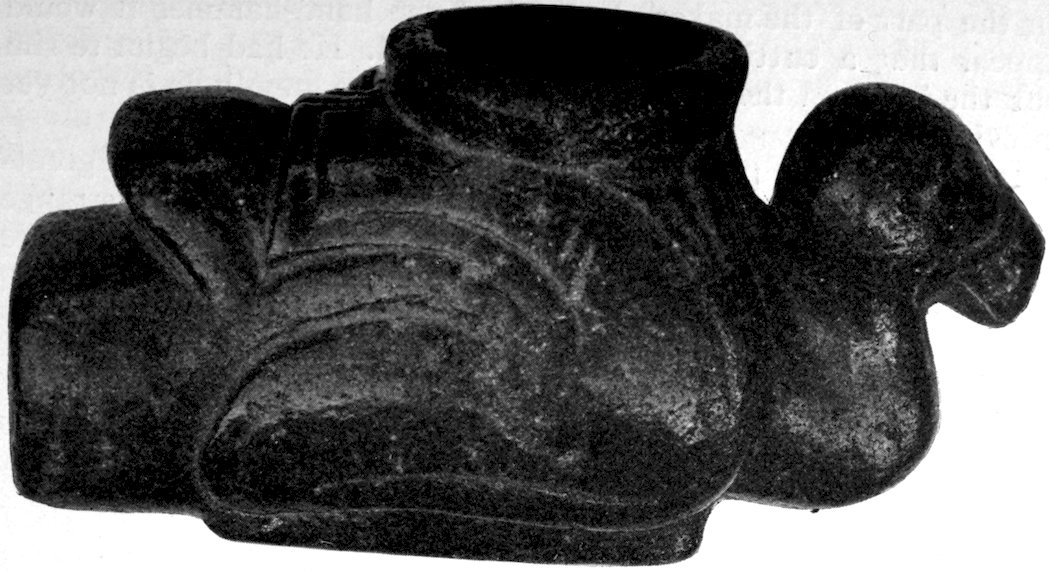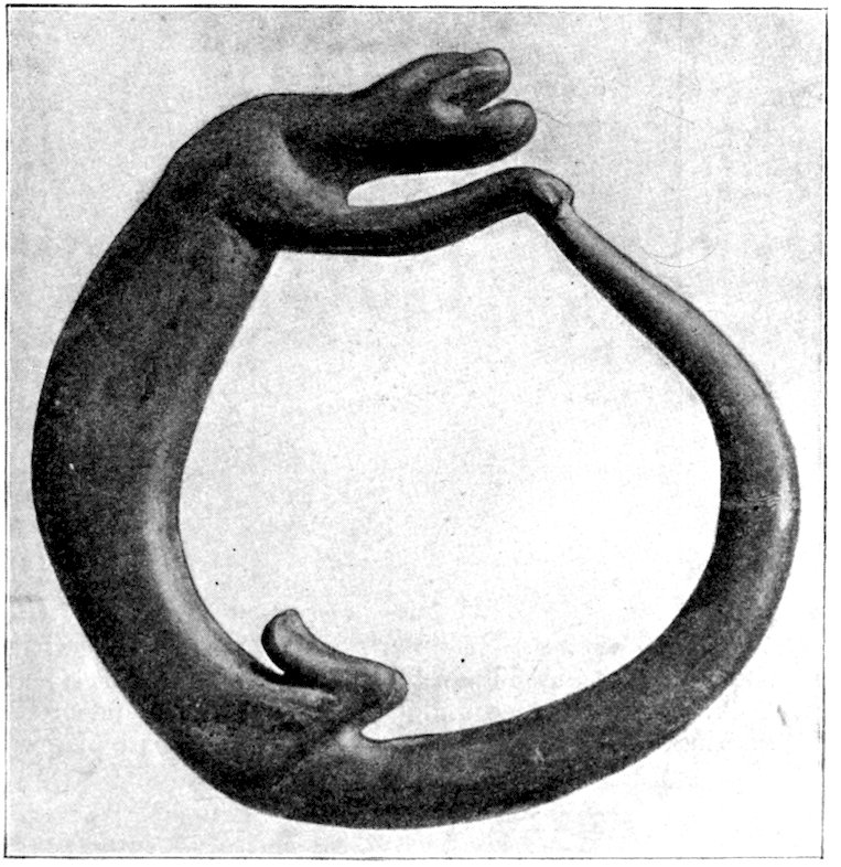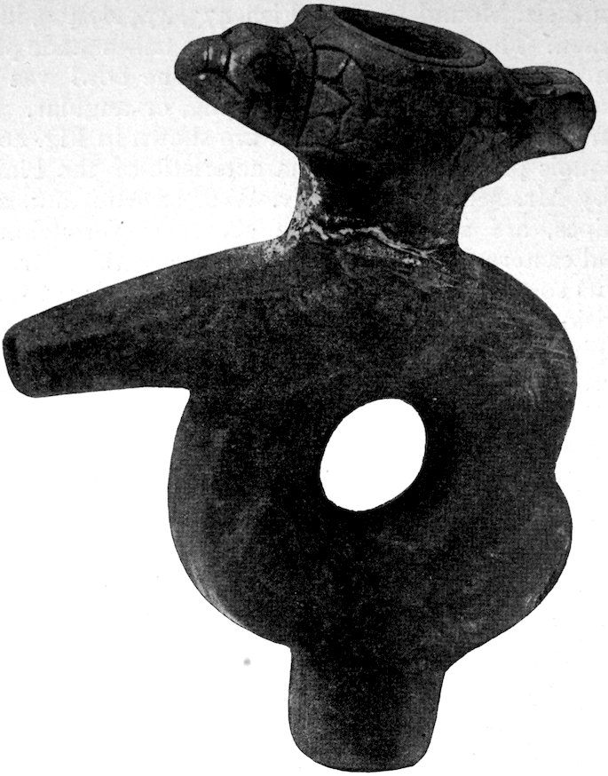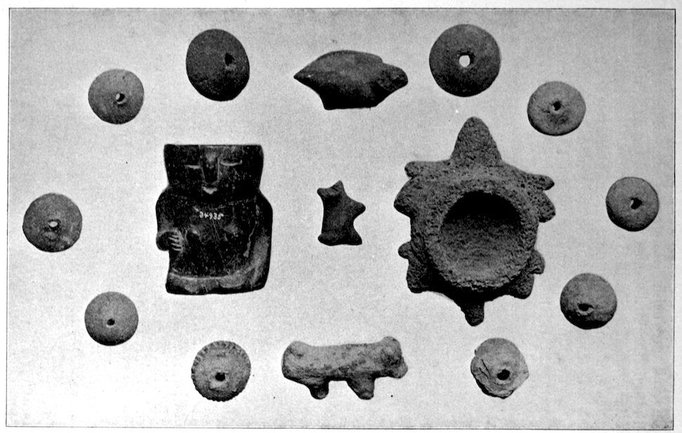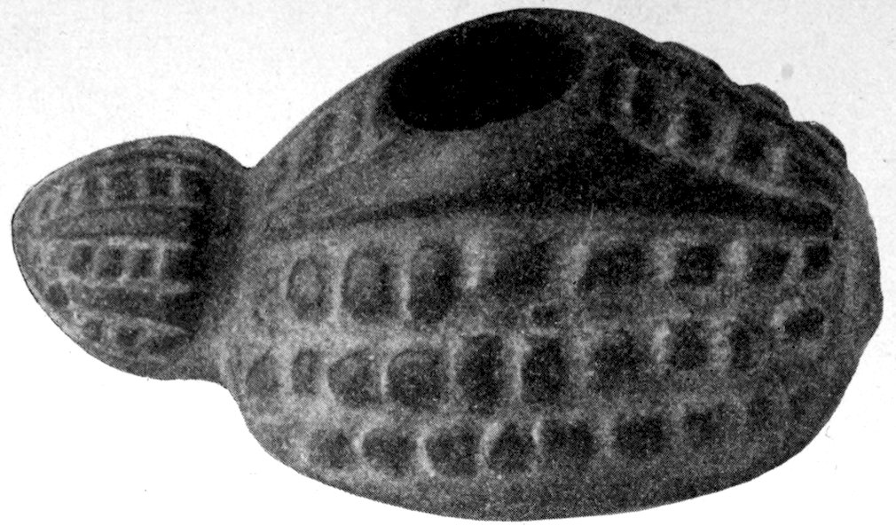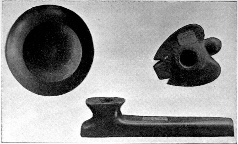 It is significant that the Plains tribes and all the natives who did not construct mounds or earthworks, natives that had not reached the stage of barbarism but were still savages, made no effigies of consequence. The effigies carved in catlinite, and observed among tribes west of the Mississippi during the historic period, seem to have been inspired by a knowledge of the superior arts of the white people. We find that while the roving tribes of the Plains painted various battle and hunting scenes on their tents and shields, yet they were inferior in art as compared with the Pueblo, the Cliff-Dweller, or the Mound-Building peoples. It is also significant, and I shall speak of it at greater length in my Conclusions, that the native American was so little influenced in his art by some life-forms. I have never seen an effigy of a mountain, a tree, a plant, or a flower. The modern Ojibwa Indians design flowers in their bead-work. The ancient Ojibwa did not. The native American did not seem to have been impressed by plant-life or inanimate 4objects. Occasionally, he scratched a trail or a tipi on an ornament, and some of the pictographs in various portions of the United States show wigwams, trails, etc. But while there are numerous examples of carvings in stone, shell, and bone of animals, birds, fish, and reptile life, we search in vain for carvings of the other things I have mentioned. The highest art is found where the largest villages, or the most numerous mounds or cliff-houses, were located. In small mound groups, or areas where the population was not sedentary, the art is very crude. Throughout the areas where the culture is highest, notably Alabama, Georgia, Wisconsin, Tennessee, Arkansas, Missouri, Ohio, and Illinois, we find these large mound groups referred to, all of which proves that the people lived long enough in one place to develop an art.