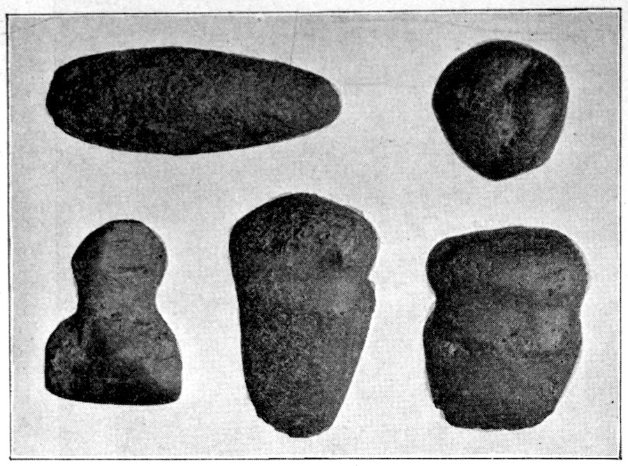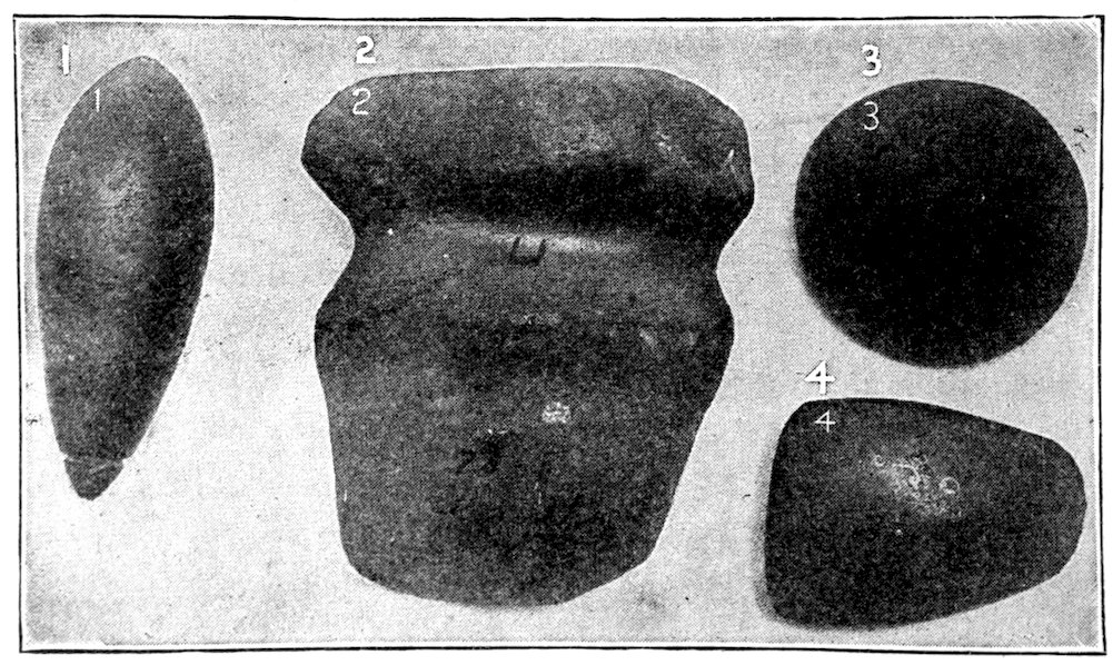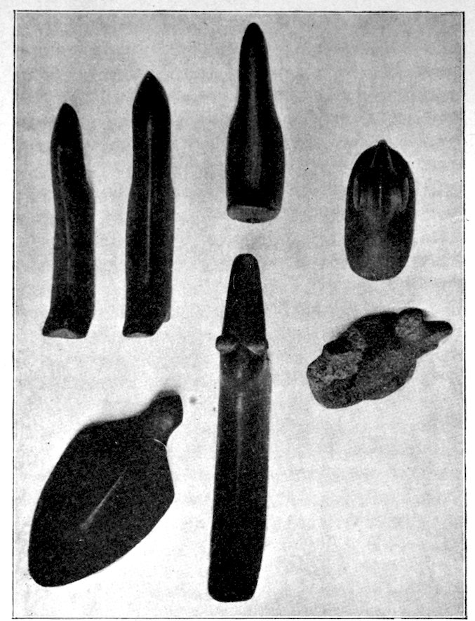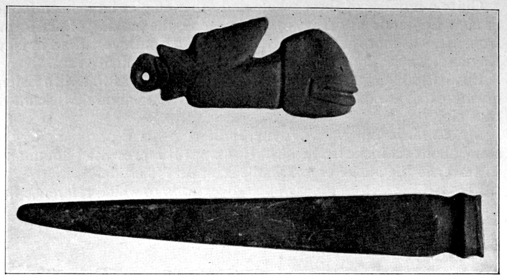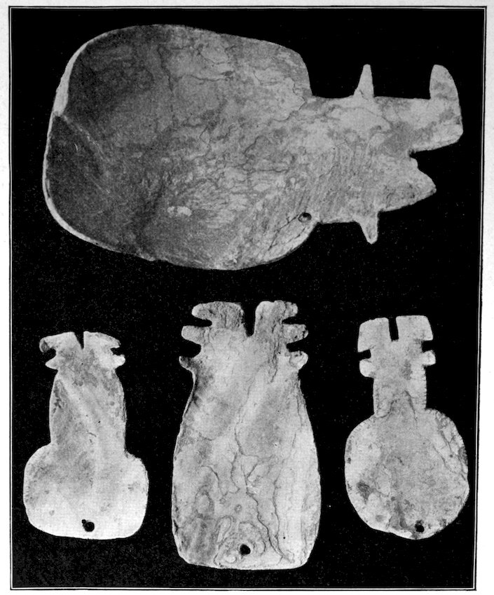 Two grooved effigies and two celts, from the Bahama Islands, West Indies. Reproduced in natural colors. B. W. Arnold’s collection, Albany, New York.
