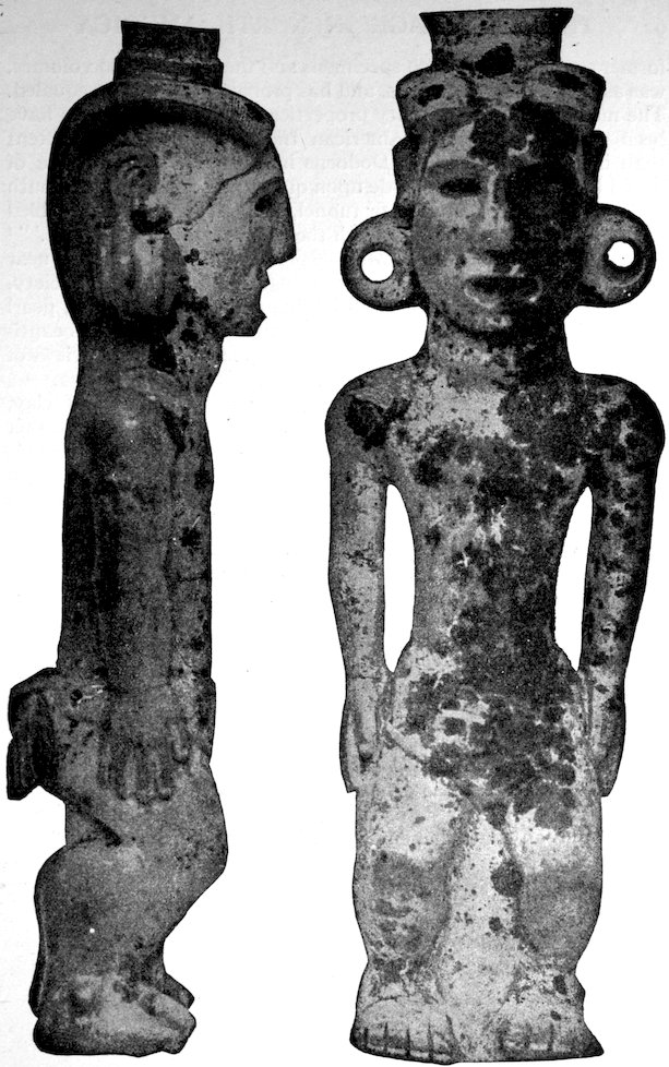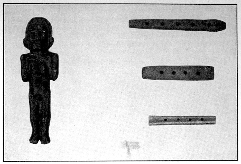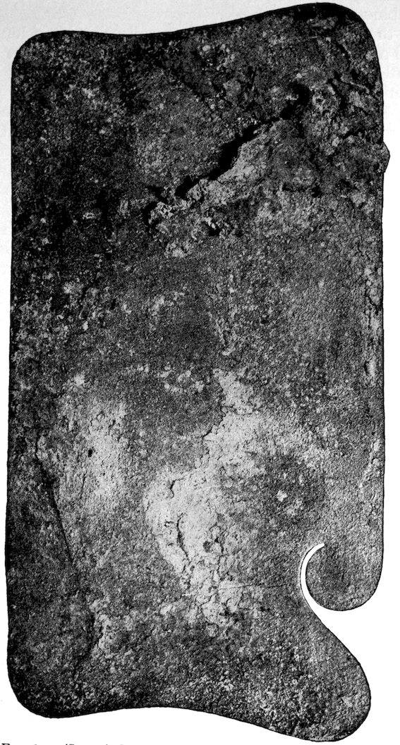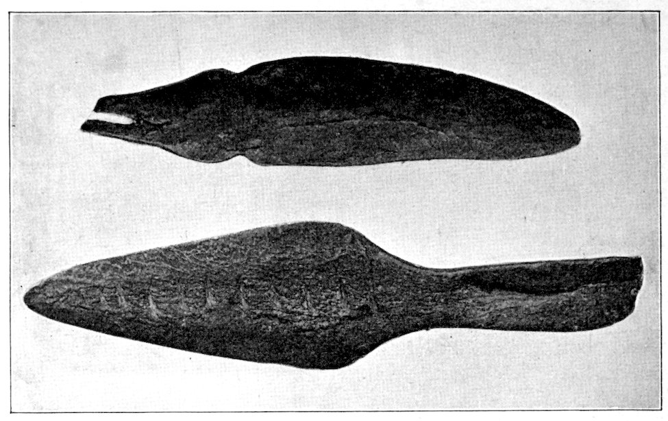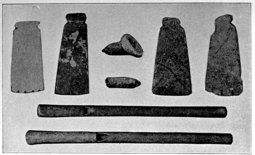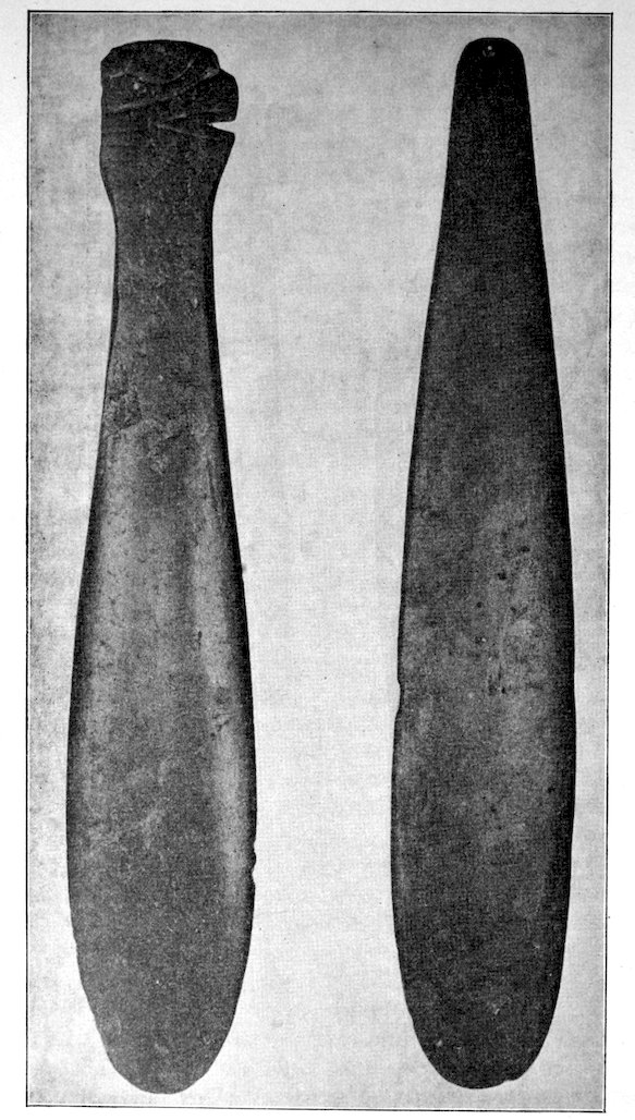 Two grooved effigies and two celts, from the Bahama Islands, West Indies. Reproduced in natural colors. B. W. Arnold’s collection, Albany, New York.