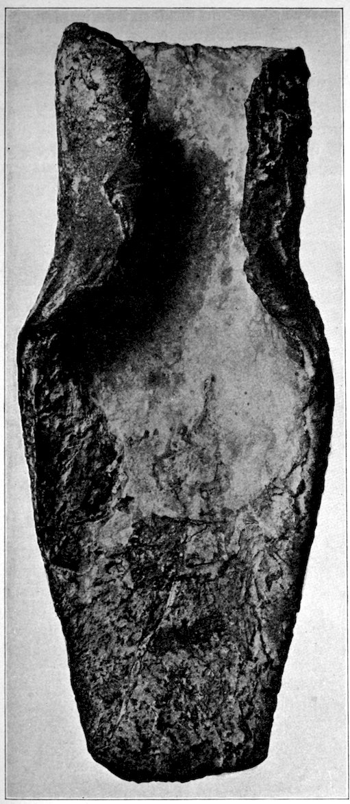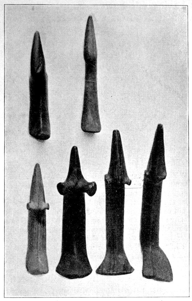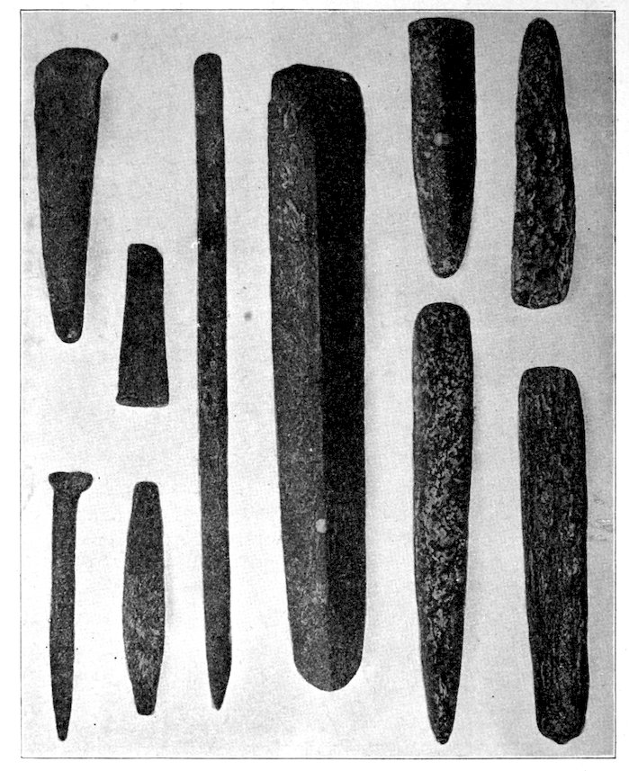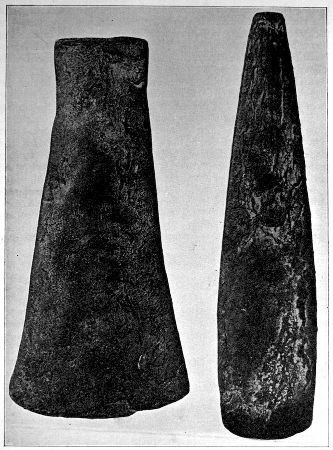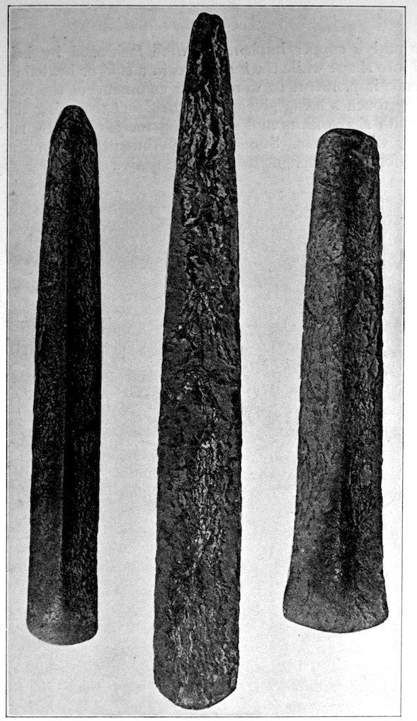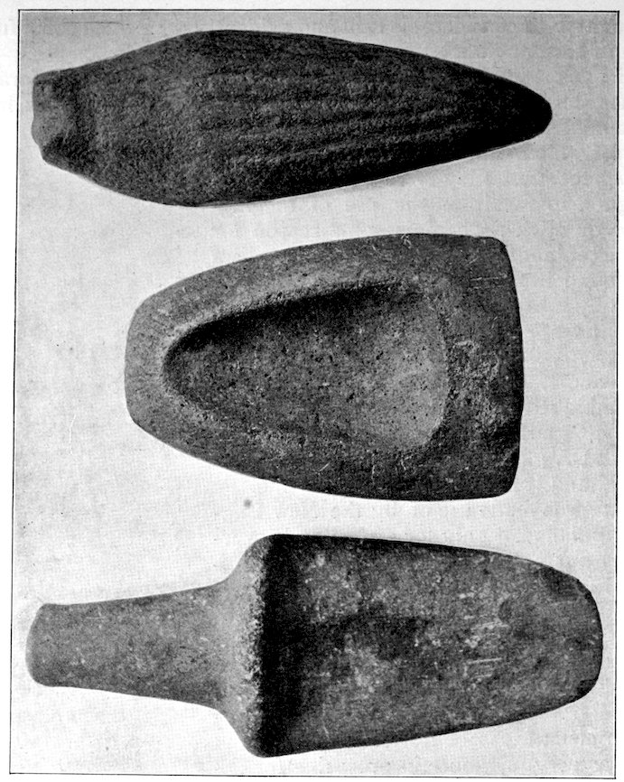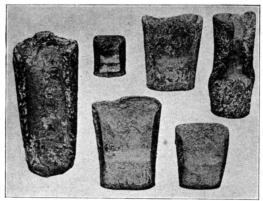 The specimens clearly show the work of the hand-hammer. Fig. 401 and the upper right-hand specimen in Fig. 399 have been pecked into shape and the grinding-polishing process was well under way when the specimen was set aside, or lost.
