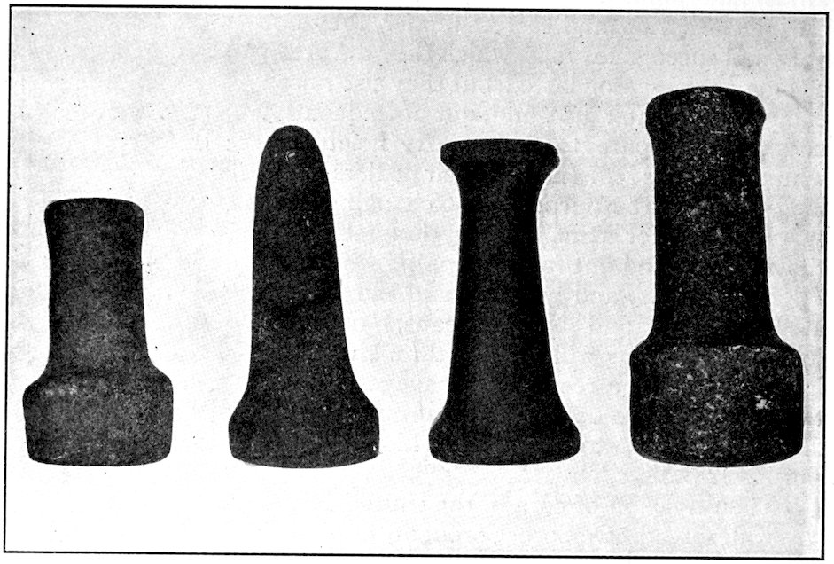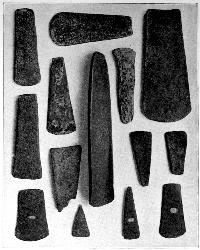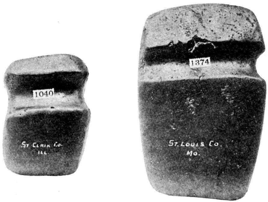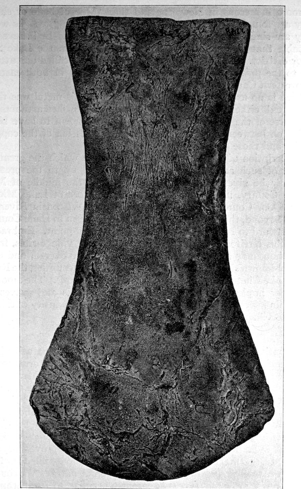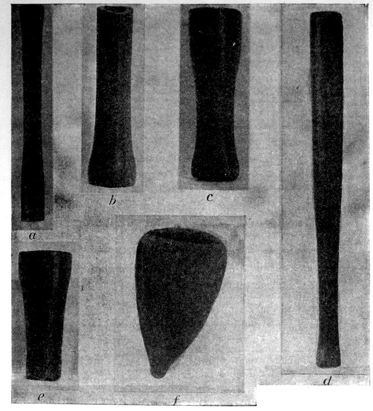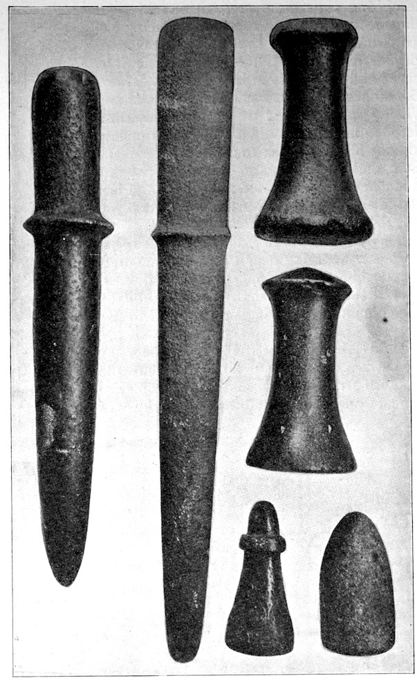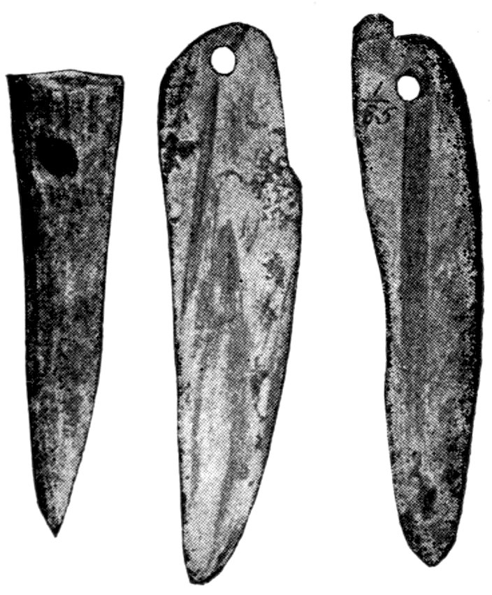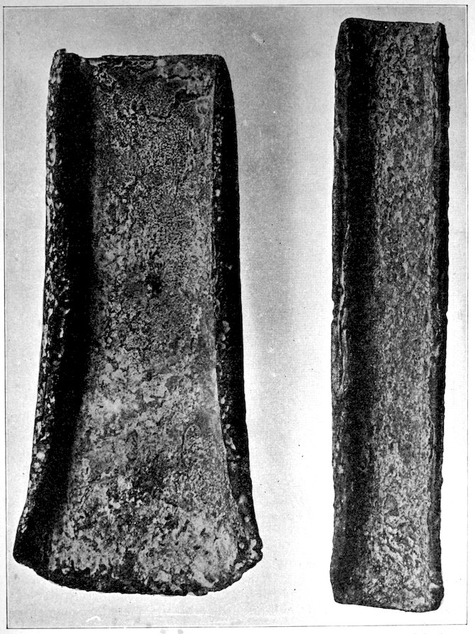 The specimens clearly show the work of the hand-hammer. Fig. 401 and the upper right-hand specimen in Fig. 399 have been pecked into shape and the grinding-polishing process was well under way when the specimen was set aside, or lost.
