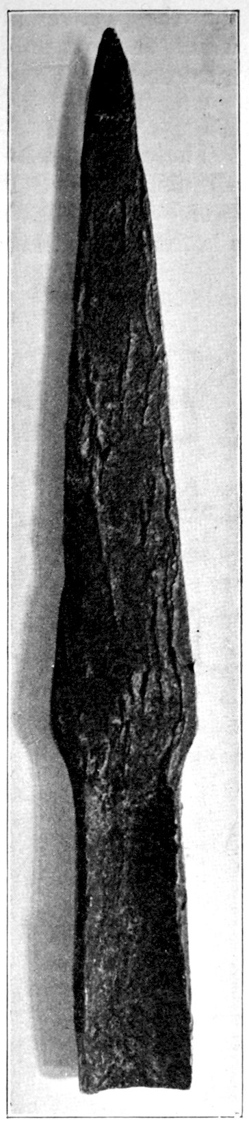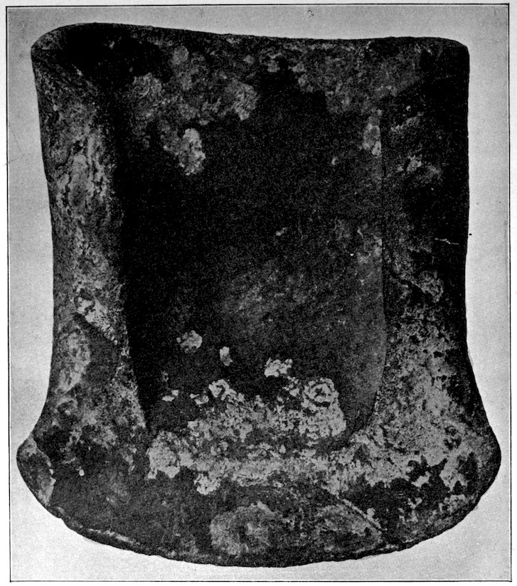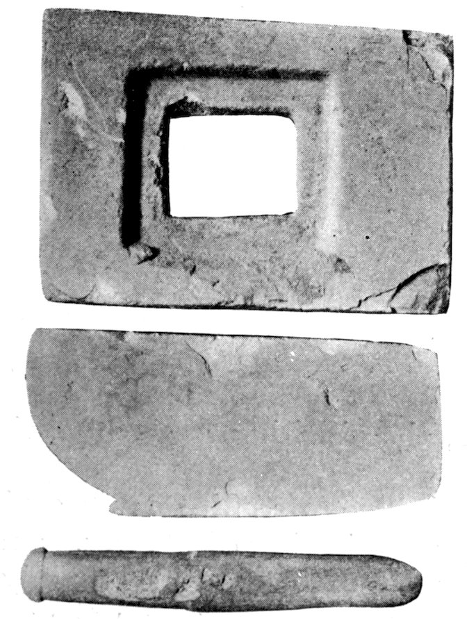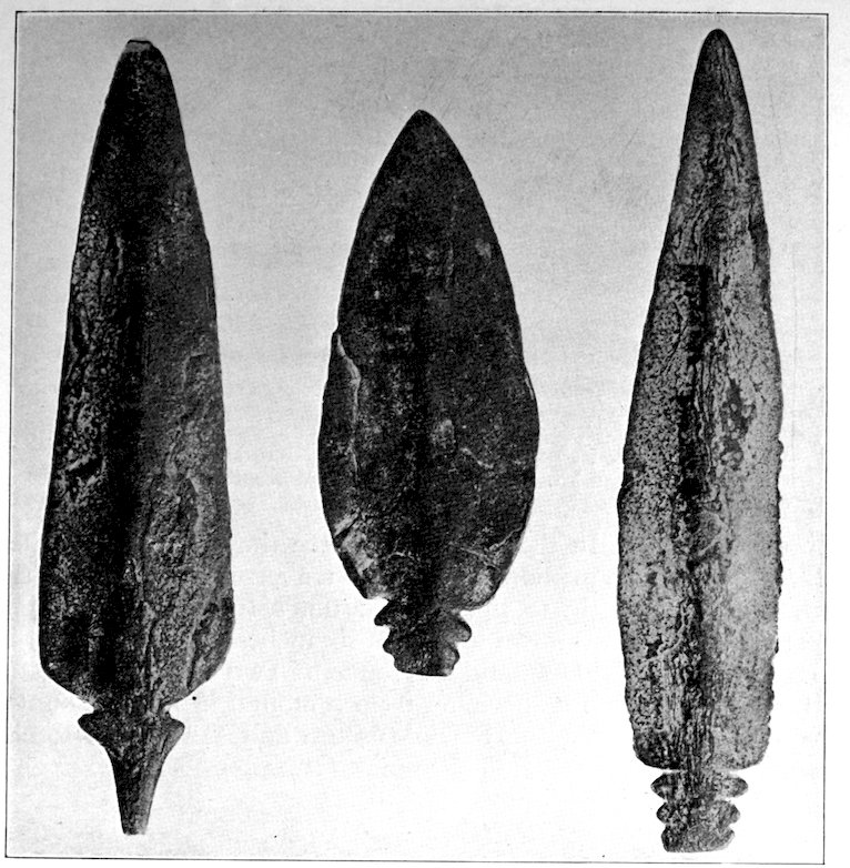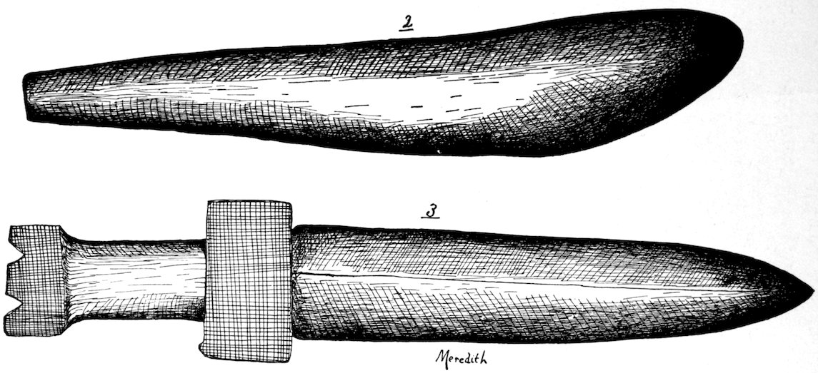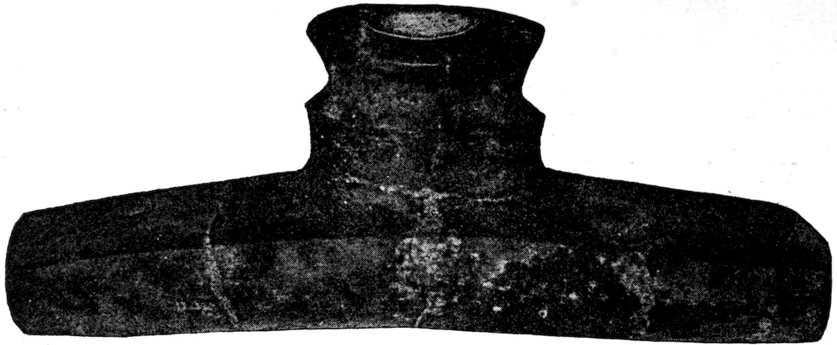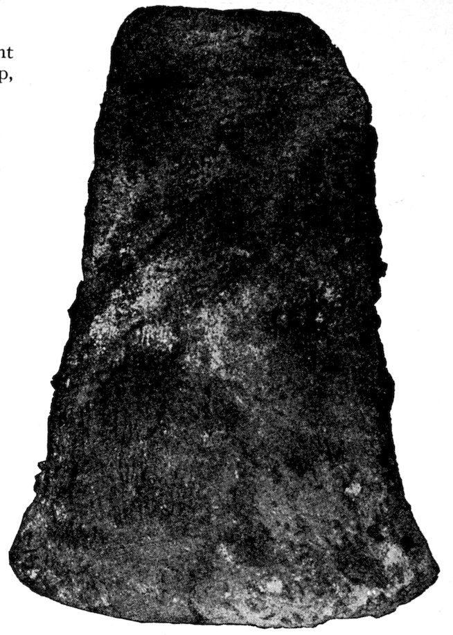 The specimens clearly show the work of the hand-hammer. Fig. 401 and the upper right-hand specimen in Fig. 399 have been pecked into shape and the grinding-polishing process was well under way when the specimen was set aside, or lost.