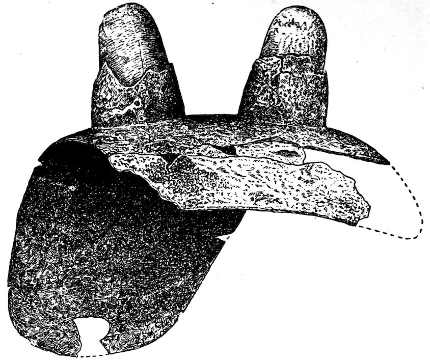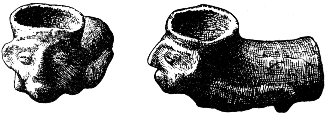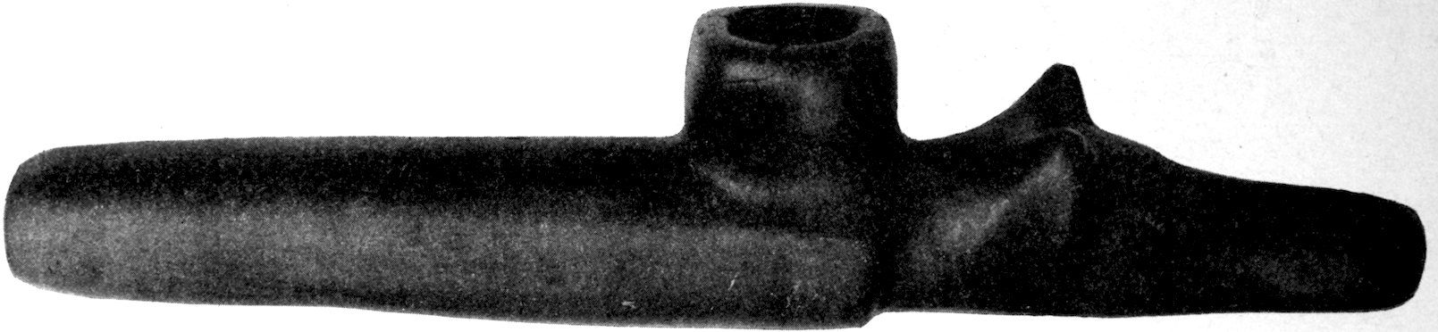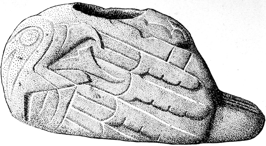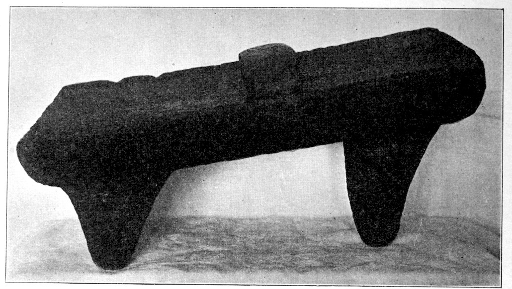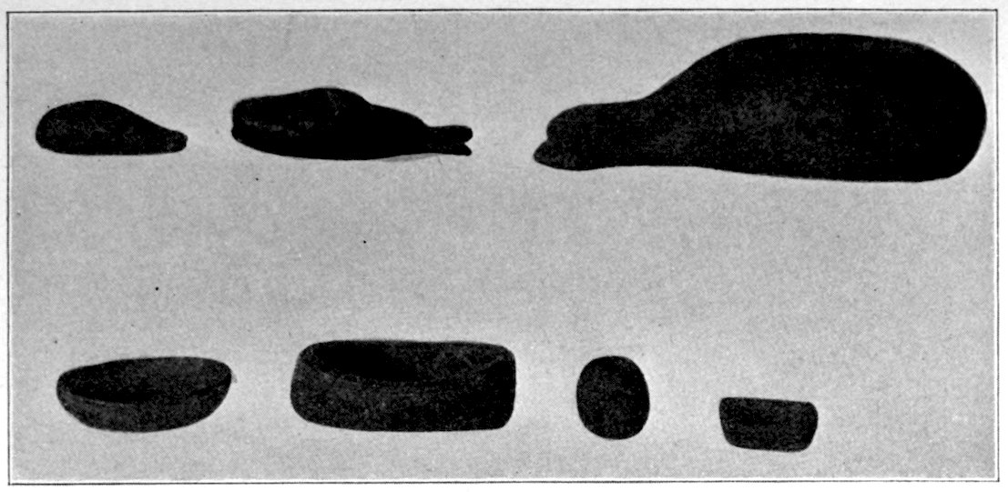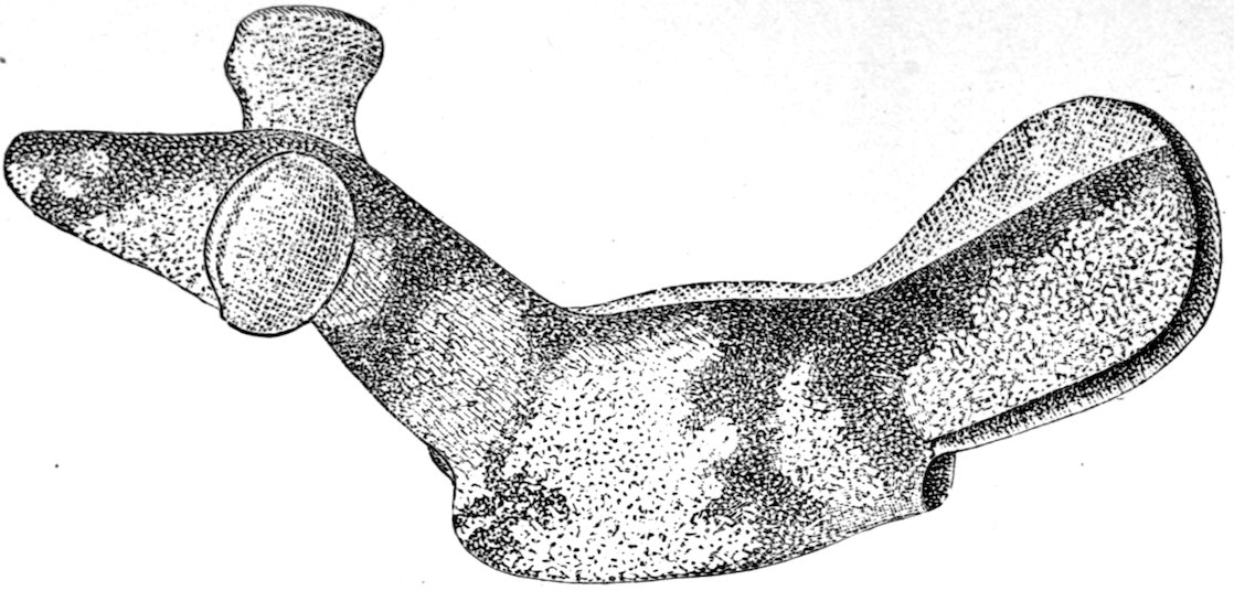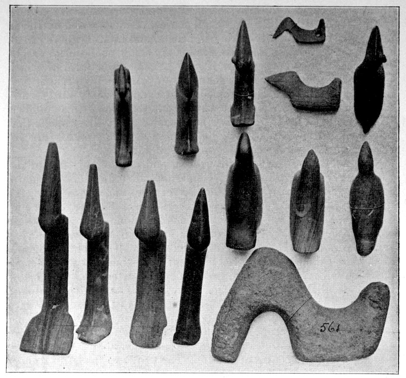 The classification made is rendered difficult because there are effigies in bone, shell, clay, and stone, not to omit copper. Such effigies as were drilled and used as pipes are described under the chapter devoted to pipes. The bone effigies are included in the chapter devoted to shell and bone, while copper is separately treated. Yet there remains, after treating more or less completely of these 5various divisions, a large class of stone objects which are not pipes, or tools, or dishes, and which I have thought best to include by themselves. The largest division in effigies is the so-called bird- or saddle-stone which is found between the following lines: Davenport, Iowa, to central Minnesota, east to New Brunswick, south to the Atlantic Coast, and thence south down the coast to Washington, thence west to Davenport. Few bird-stones occur south of Kentucky, west of Davenport, or north of St. Paul. The other effigies are of multitudinous kinds and are widely scattered throughout the United States.