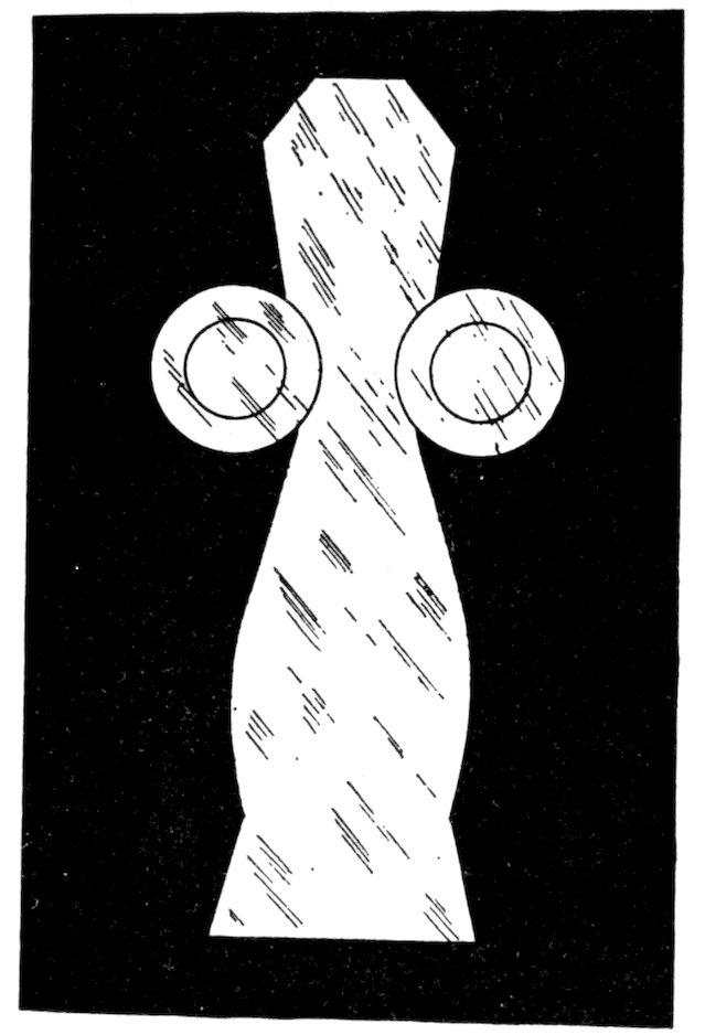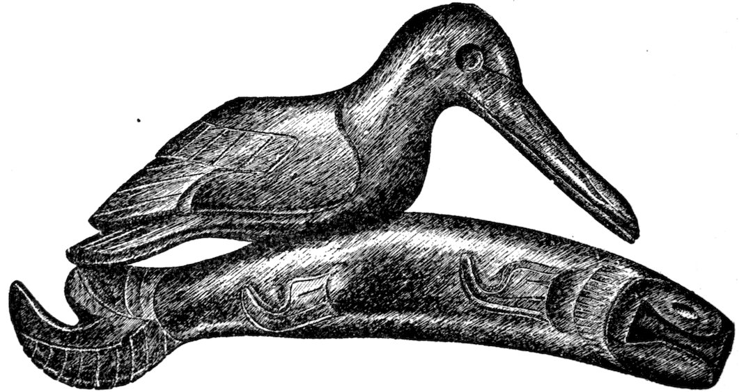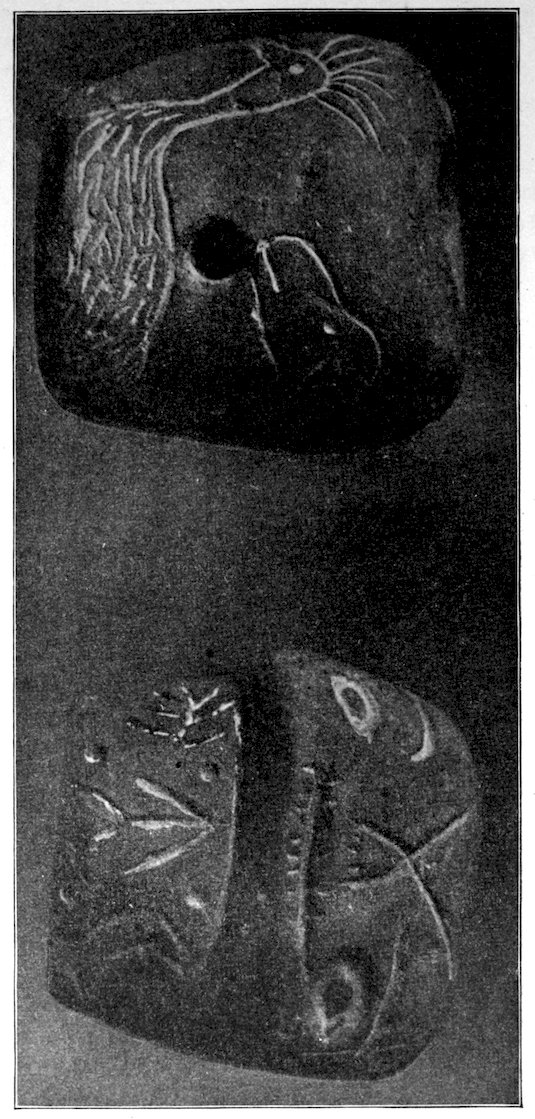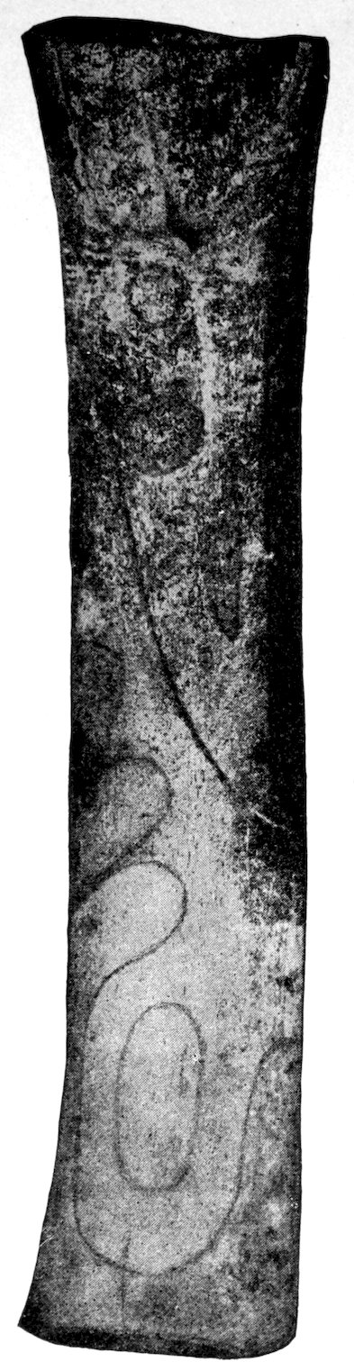 Aboriginal man traced all sorts of figures on the rocks and occasionally on the surfaces of flat ornaments and ceremonials. Not only did he make pictures on shell gorgets and on birch bark, but he also carved complete figures.