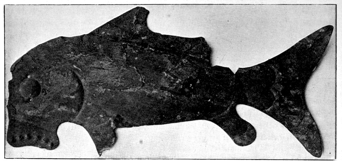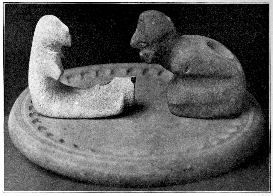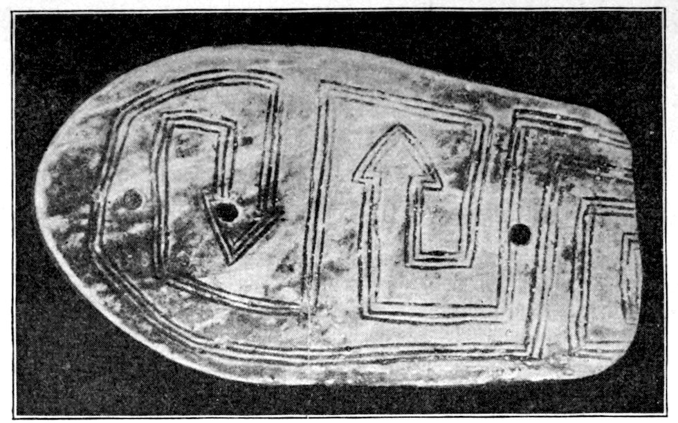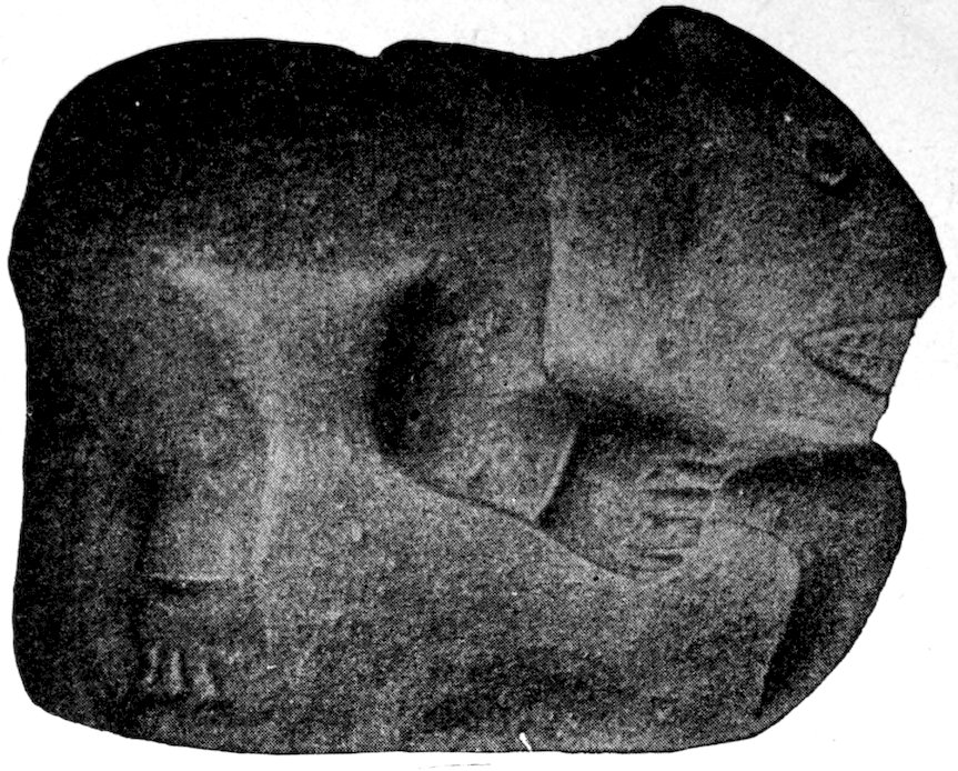 I have not made a special chapter for pictographs and picture writings, but have dismissed them from this work, save with here and there a reference. However, they represent stone-age pictorial art. Dr. Fewkes, Mr. Cushing, Dr. Garrick Mallory and others have given us numerous papers on picture writings, pictographs, painted and sculptured symbols. Garrick Mallory’s report on the sign language among the American Indians was published in the Eleventh Annual Report of the Bureau of Ethnology and covers four hundred pages. This treats extensively of picture writings and pictographs. He portrayed the attempts of stone-age man at expressing his thoughts. He had not arrived at a written language save in Mexico and Central America. In North America he was in the advanced stone age. But he was very skillful in his pictographs and in his carvings of human, animal, bird, reptile, and fish figures. It has occurred to me that he first made rude scratches on flat surfaces, on wigwam sides, on trees, on rocks near trails.
