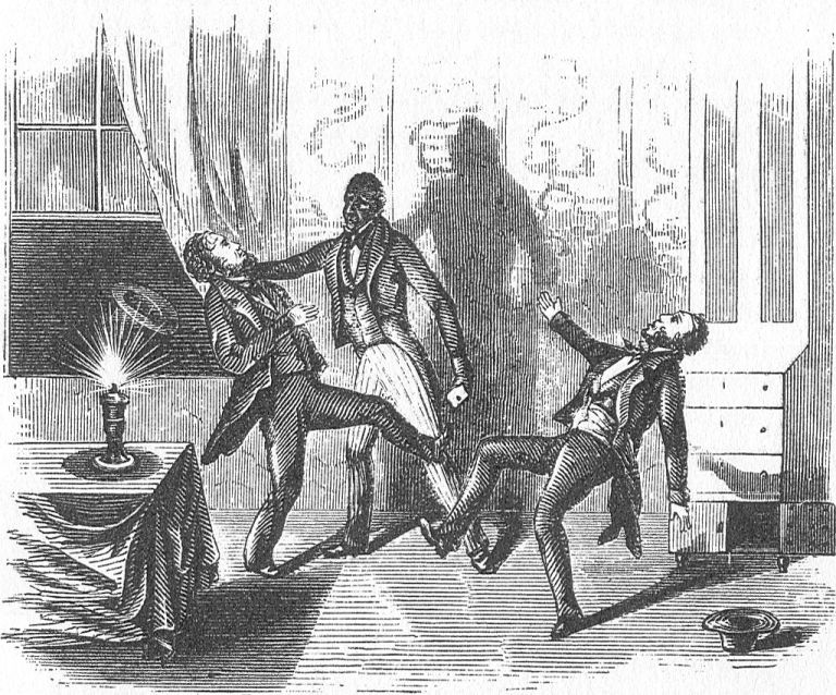 De Guy perceived the movement of Jaspar, and, as soon as the combatants had fallen to the floor, he restored the pistol to his pocket, so that, unembarrassed, he might convey Emily to a place of security, until this unlooked-for contest was ended. Scarcely was the pistol in his pocket, when the window behind him flew open, and the attorney was in the iron grip of a powerful arm! Emily, freed from her assailant, retreated to the other side of the room, where, glancing in terror upon the new assault, she saw De Guy thrown violently upon the floor by her ever-present and ever-faithful slave, Hatchie!