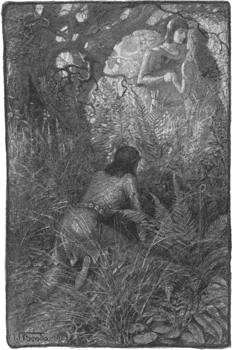The man knelt in a patch of bracken, and looked out over the glade. A figure went to and fro by the water’s brim, a figure pale in the moonlight, with a glimmering flash of unloosed hair. The man kneeling in the bracken[382] pressed his hands over his breast; his face seemed to start out of the gloom like the face of one who struggles in the sea, submerged, yet desperate.