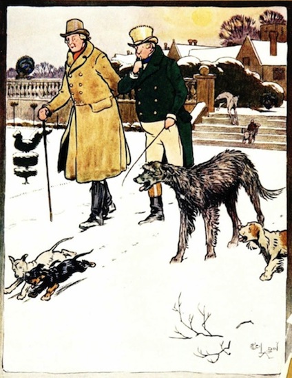 After breakfast I walked about the grounds with Frank Bracebridge and Master Simon. We were escorted by a number of gentlemanlike dogs, that seemed loungers about the establishment; from the frisking spaniel to the steady old staghound; the last of which was of a race that had been in the family time out of mind.