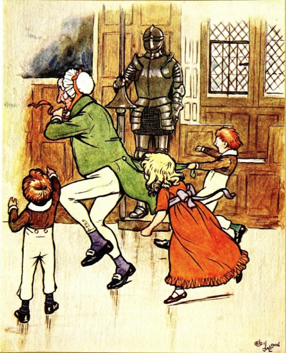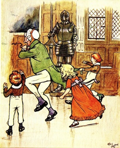 After the dinner-table was removed, the hall was given up to the younger members of the family, who made its old walls ring with their merriment, as they played at romping games. Master Simon, who was the leader of their revels, and seemed on all occasions to fulfil the office of that ancient potentate, the Lord of Misrule, was blinded in the midst of the hall. The little beings were as busy about him as the mock fairies about Falstaff; pinching him, plucking at the skirts of his coat, and tickling him with straws.
