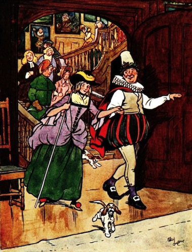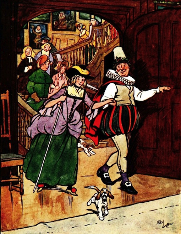 Master Simon led the van, as ‘ancient Christmas,’ quaintly apparelled in a ruff, a short cloak, which had very much the aspect of one of the old housekeeper’s petticoats, and a hat that might have served for a village steeple, and must indubitably have figured in the days of the Covenanters. From under this his nose curved boldly forth, flushed with a frost-bitten bloom, that seemed the very trophy of a December blast. He was accompanied by the blue-eyed romp, dished up as ‘Dame Mince-Pie,’ in the venerable magnificence of faded brocade, long stomacher, peaked hat, and high-heeled shoes. The rest of the train had been metamorphosed in various ways; the girls trussed up in the finery of the ancient belles of the Bracebridge line, and the striplings bewhiskered with burnt cork, and gravely clad in broad skirts, hanging sleeves, and full-bottomed wigs, to represent characters celebrated in ancient maskings.
