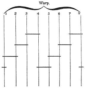 There is a variety of diagonal weaving practiced by the Navajos which produces diamond figures; for this the mechanism is the same [Pg 384]as that just described, except that the healds are arranged differently on the warp. The following diagram will explain this arrangement.