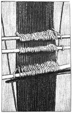 When the warp is transferred to the loom the rod which was placed in the upper shed remains there, or another rod, straighter and smoother, [Pg 380]is substituted for it; but with the lower shed, healds are applied to the anterior threads and the rod is withdrawn.