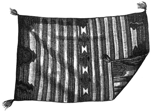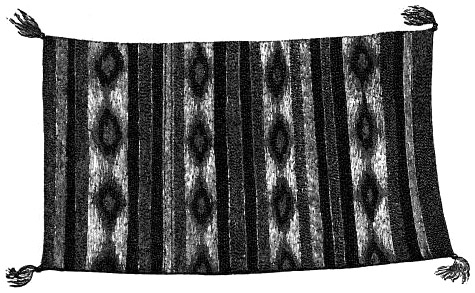 § IX. Navajo blankets represent a wide range in quality and finish and an endless variety in design, notwithstanding that all their figures consist of straight lines and angles, no curves being used. As illustrating the great fertility of this people in design I have to relate that in the finer blankets of intricate pattern out of thousands which I have examined, I do not remember to have ever seen two exactly alike. Among the coarse striped blankets there is great uniformity.
