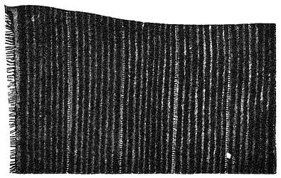 When the web is so nearly finished that the batten can no longer be inserted in the warp, slender rods are placed in the shed, while the weft is passed with increased difficulty on the end of a delicate splinter and the reed-fork alone presses the warp home. Later it becomes necessary to remove even the rod and the shed; then the alternate threads are separated by a slender stick worked in tediously between them, and two threads of woof are [Pg 383] inserted—one above and the other below the stick. The very last thread is sometimes put in with a darning needle. The weaving of the last three inches requires more labor than any foot of the previous work.