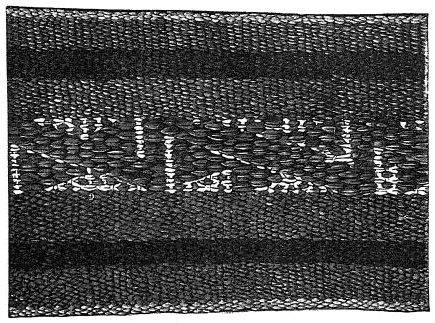 When this is all ready the insertion of the weft begins. The reed-fork is rarely needed and the batten used is much shorter than that employed in making blankets. Fig. 57 represents a section of a belt. It will be seen that the center is ornamented with peculiar raised figures; these are made by inserting a slender stick into the warp, so as to hold up certain of the threads while the weft is passed twice or oftener underneath them. It is practically a variety of damask or two-ply weaving; the figures on the opposite side of the belt being different. There is a limited variety of these figures. I think I have seen about a dozen different kinds. The experienced weaver is so well acquainted with the "count" or arrangements of the raised threads appropriate to each pattern that she goes on inserting and withdrawing the slender stick referred to without a moment's hesitation, making the web at the rate of 10 or 12 inches an hour. When the web has grown to the point at which she cannot weave it further without bringing the unfilled warp nearer to her, she is not obliged to resort to the clumsy method used with blankets. She merely seizes the anterior layer of the warp and pulls it down towards her; for the warp is not attached to the beams, but is movable on them; in other words, while still on the loom the belt is endless. When all the warp has been filled except about one foot, the weaving is completed; for then the unfilled warp is cut in the center and becomes the terminal fringes of the now finished belt.