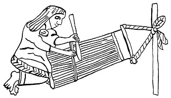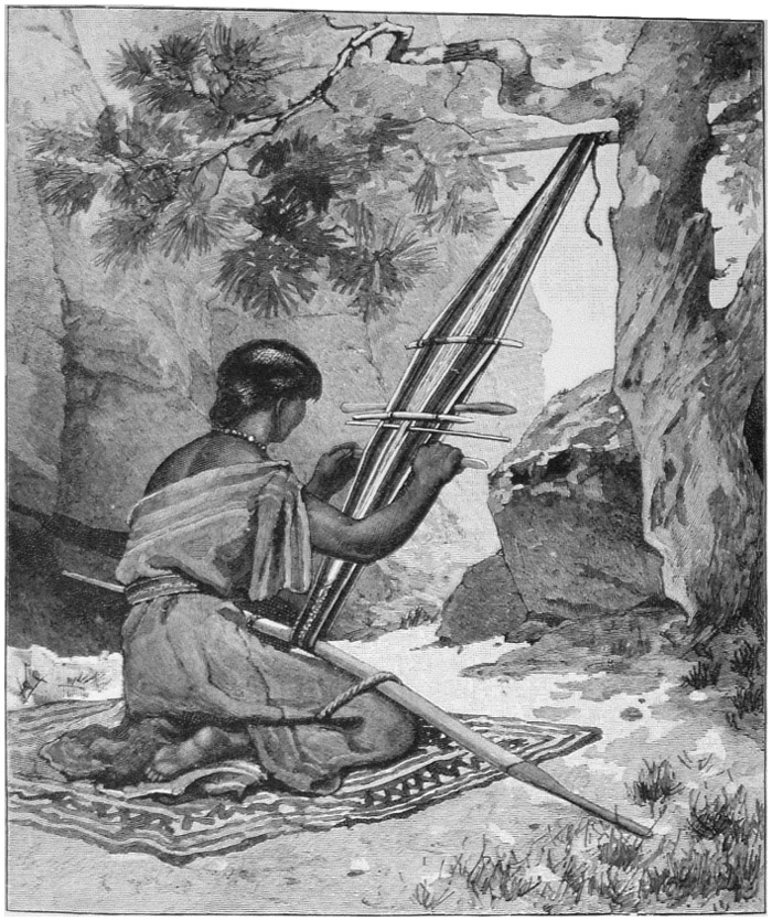 § XI. I will close by inviting the reader to compare Plate XXXVI and Fig. 59. The former shows a Navajo woman weaving a belt; the latter a girl of ancient Mexico weaving a web of some other description. The one is from a photograph, taken from life; the other I have copied from Tylor's "Anthropology" (p. 248); but it appears earlier in the copy of Codex Vaticana in Lord Kingsborough's "Antiquities of Mexico." The way in which the warp is held down and made tense, by a rope or band secured to the lower beam and sat upon by the weaver, is the same in both cases. And it seems that the artist who drew the original rude sketch, sought to represent the girl, not as working "the cross-thread of the woof in and out on a stick," but as manipulating the reed-fork with one hand and grasping the heald-rod and shed-rod in the other.