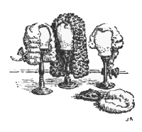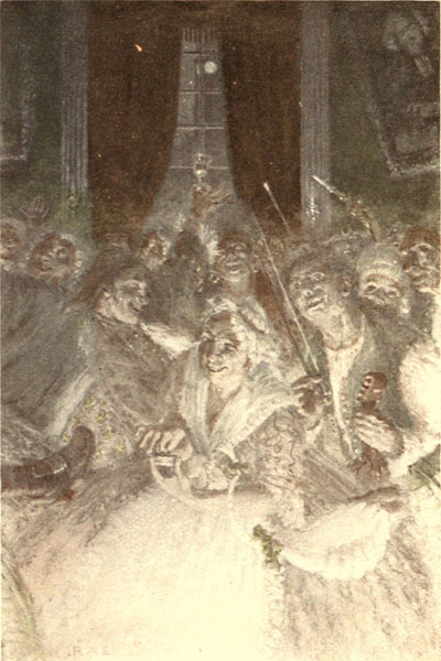 As the merriment waxed louder a Gobie, who had spent her life as a fish-fag, began tapping on the panelled wainscot. With a hoarse guffaw she turned her piercing alaquine eyes on Miss Julie and squinted—"More negus! More here, you slubber-degullions. We Gobies has a thirst. 'Twas what we were [Pg 126] noted for in life—not our learning, great-niece," she mocked, as she turned her head and grimaced at Miss Georgina.