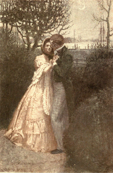 The old vehicle held but six, [Pg 24] and as the aunts always rode home with their brother, Patricia was left to the escort of Juma, custodian of the prayer-books. By the clump of protecting boxwood at the end of the Marine Parade she had come upon him. The sea held his eyes until there was no mistaking the footsteps. Her approaching crinoline made soft little rustles, as if entreating him to leave his musings. Her body-guard's shuffles, too, were unmistakable. Like some young potentate her lover turned about, describing an elaborate bow with his white castor. The very picture of starched tranquillity he looked, but underneath the blue hammer-tail coat a heart was beating [Pg 25] wildly, as she, made wise by love, knew well—for her own was its echo.