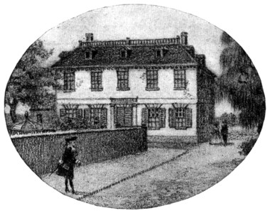 The image of this fascinating gentleman was constantly haunting Betsey Shewell's mind as she sat moping by the door of Benjamin Franklin's parlor at the close of a summer's day one hundred and forty-one years ago. That very evening she knew he was to ride over from the Red Lion to visit Mary Shewell, then staying with Betsey Bickley at Penn Rhyn, the Bickley country house, five miles below Bristol on the Delaware. He was with his "shy, dark-haired Mary" now, no doubt. Try as she would,[20] it seemed impossible for her to forget him. Her sister Bickley, observing her sad face, began to fidget. She looked at her with disgust and was about to speak, when the sound of the knocker suddenly reverberated through the house, and Sarah, hastening to open the front door, welcomed in a party of belated guests.