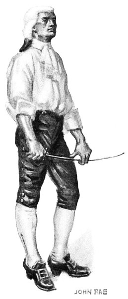 Philadelphia was a gossipy place in the days before the Revolution, and it soon became noised abroad that the young limner West was paying court to Betsey Shewell. The Bickleys had retired to Penn Rhyn, but the maiden still stayed on at her brother Shewell's abode. This brother Shewell was a wealthy man, following the mercantile calling of many of his family. It is a tradition that he desired to marry his sister to[26] a Water Street compatriot over twice her age, and therefore frowned on any gentleman whose admiration was ardent enough to lead him to call upon her. West had visited the fair sister several times before the rumors of their love-affair reached his ears. Returning one night from the Hat Tavern, where he had business with one Widow Cadwell, he fell in with a meddlesome friend of Betsey's who inadvertently told him of the tales that were floating about the town. That a saucy nincompoop of a painter should dare set his eyes on one of the Shewells was a strange thing to this arrogant gentleman whose days were bound with buckram. Nevertheless, he resolved to deal summarily with all parties concerned and sift the matter to the bottom. At first he thought of calling out West, but decided that it would create too much scandal; besides, although the painter's usual demeanor was most peaceable, it was said that while in the Lancaster militia he had become well[27] skilled in the use of his sword. As he rode homeward his anger grew at every rod the horse covered. He scowled at the timorous handmaiden who opened the door of his house. His spurs beat the hard pine-wood floor as he strode through the hall.