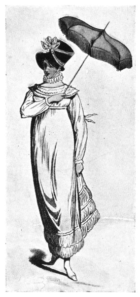 "Pappy" and his daughter had come on their long-promised visit to the Bickleys. Sarah Franklin was radiant with happiness, and it was easy to see that her father reflected her mood. A sight to behold she was when she descended from the side step. Her gown, the fought-for store silk, was garnished with a multitude of varicolored prim flowers, and its folds tried in vain to cover her Paris shoes with red heels, which, in lieu of paste buckles, owing to "Pappy's" hatred of gewgaws, she had tied with red ribbons.[45] On her head she wore a stiffened pasteboard trimmed with "masqueraded bombazin" and adorned with a waving plume which the wind swayed like the dancer a venturesome manager of the new theatre had put on in the tragedy "The Orphan."