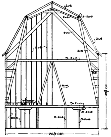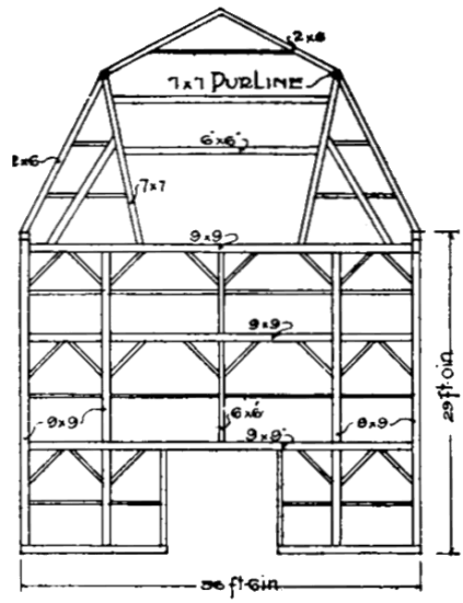 Remarks: Considering its size, the construction of this barn is apparently too light to be substantial, as the joists and studs are too small and too far apart, yet it has stood for nine years with no more evidence of wear than is common with any barn.