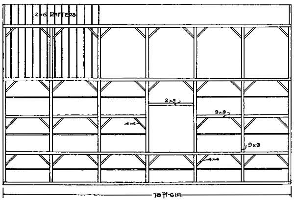 Figures 6 to 9 are side and end views, showing the detail construction and size of the timbers of the plank frame and mortise frame barns here figured. The detailed figures of the lumber bills for each of these barns were carefully worked out, but are too voluminous for publication here. The total number of feet of each kind of lumber required is given in Tables 1A and 1B. Since the proportion of the different kinds of lumber and shingles varied for the different barns, to draw an exact comparison it was[Pg 9] necessary to base it upon the money value, and for this purpose the total cost of lumber has been figured in each case. The lumber values used thruout are the best average prices that could be obtained. As the same prices are used for the material of all the barns, the comparisons of cost are correct, altho these exact prices will not hold for all localities and all times.