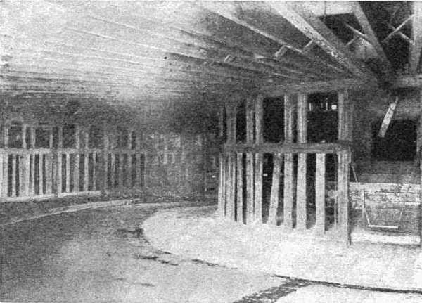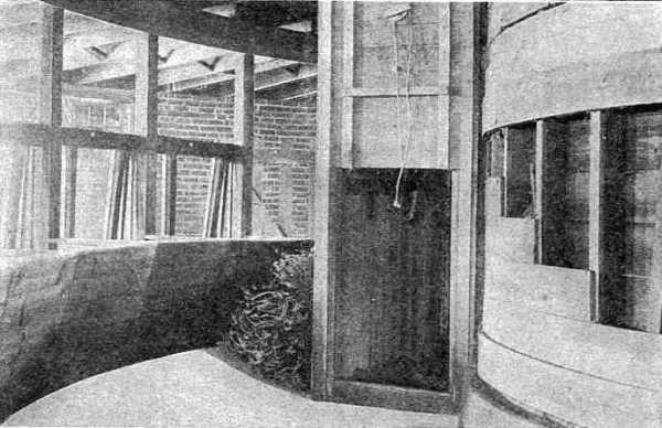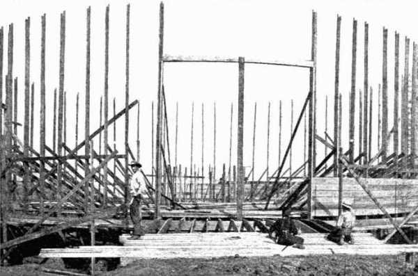 [Pg 32]Roof supports, 6 × 6s placed 12 feet apart. Purline plate rests on these posts and consists of 1 × 8s sprung to the circle.