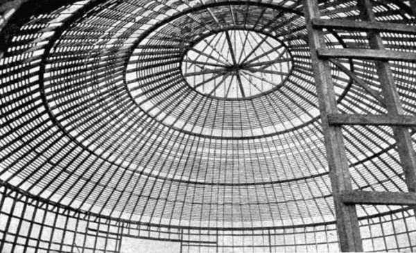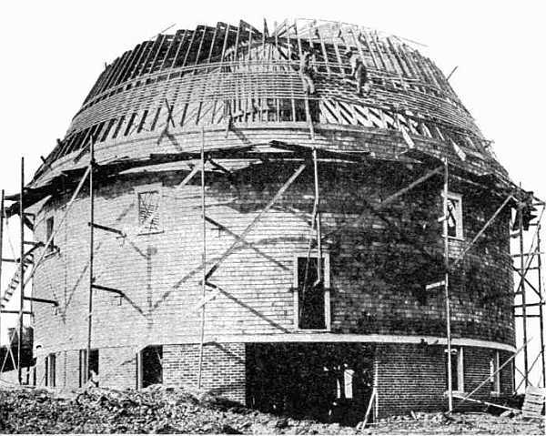 The difficulty with most round barns that have been built, thus far, is that they do not have a self-supporting roof, and consequently lose many of the advantages of a properly constructed round barn. This is the principal reason why round barns have not become more popular. A straight roof necessarily requires many supports in the barn below. These are both costly and inconvenient, and make the roof no stronger than a dome-shaped, self-supporting roof which nearly doubles the capacity of the mow. See Fig. (1).
