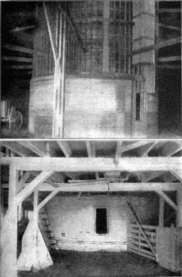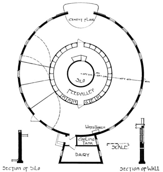 [Pg 37]The owner says it would have cost him as much to have built a rectangular barn without the 500-ton silo, and containing 1300 sq. ft. less floor space. In other words, he gained a 500-ton silo and 1300 sq. ft. of floor space, besides an immense amount of mow room, by building a circular barn.