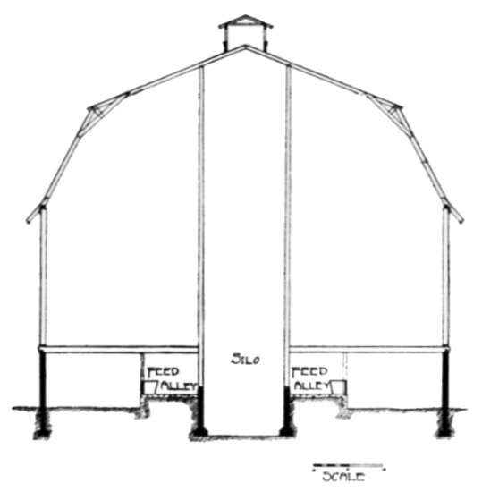 The first thing to consider in the erection of a barn is a convenient arrangement for the purpose for which it is to be used. At the University of Illinois, two years ago, a twenty-acre demonstration dairy farm was started, the sole object being to produce the largest amount of milk per acre at the least possible cost. To[Pg 4] meet the requirements of a barn for this purpose, it became imperative to build one that was convenient for feeding and caring for the cows, economical of construction, and containing a large storage capacity in both silo and mow. These are the requirements of a barn for every practical dairyman.