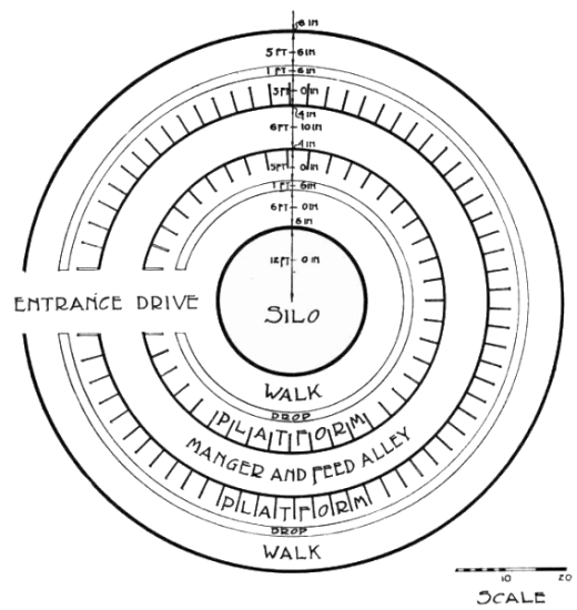 Fig. 34. Barn 92 feet in diameter; Two rows of cows headed