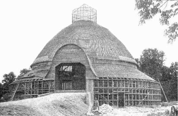 All exposed surfaces of a round barn are circular, as both the sides and roof are arched, which is the strongest form of construction to resist wind pressure; besides, the wind, in striking it, glances off and can get no direct hold on the walls or roof, as it can on the flat sides or gable ends of a rectangular structure. If the lumber is properly placed in a round barn, much of it will perform two or more functions. Every row of siding boards running around the building serves also as a brace, and the same is true of the roof boards and the arched rafters. If the siding is put on vertically and the roof built dome-shaped, no scaffolding is required inside or out. These are points of economy in the round construction.