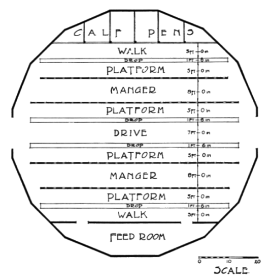 The round barns previously described do not meet the needs of the man with only a few cows. He usually wants a general-purpose barn. The circular form can be made satisfactory for this[Pg 41] purpose if proper attention is given to the plan. It is necessary that the cow stable be distinctly separated from all other stock by a tight wall. Round barns with this arrangement are giving satisfaction in Illinois at the present time.