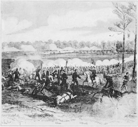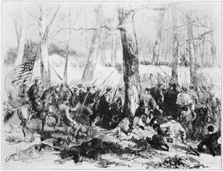 At the first streak of day—February 13, 1862—the enemy bade us good morning by sending us a shell that burst close to our lines, but doing little damage. The boys were mad and, gathering their muskets, said: “Let’s show them that we are not to be shot at without returning[27] the compliment,” but our officers were not ready to give us a chance. The battle was on, however, at other points of the line, and at last we were to have our hearts’ desires, namely, of having a shot at the enemy. We were moved shortly to the right and formed in line with our brigade.