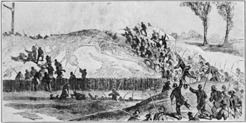 “Attention, battalion! Fix bayonets; shoulder arms; right shoulder shift, arms. Forward,[28] march!” and all moved toward the enemy’s works over very rough ground. The redoubt of the enemy was on a hill, the ground sloping down toward us, while the trees and brush had been cut down to retard our progress. Presently the bullets began to sing about our heads: zip, ping, ping, and as we climbed the hill we were met by a murderous fire of musketry; the men were falling in bunches and the enemy poured into us grape and canister from their cannons.