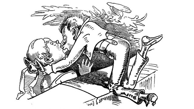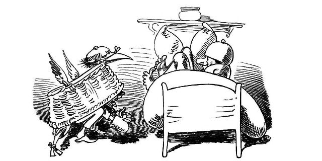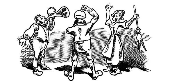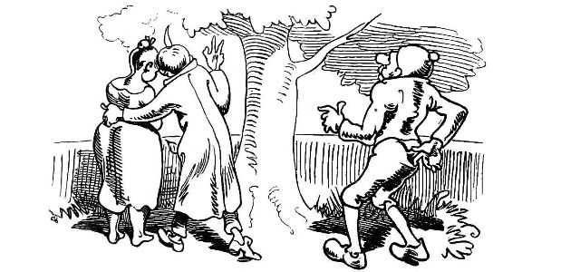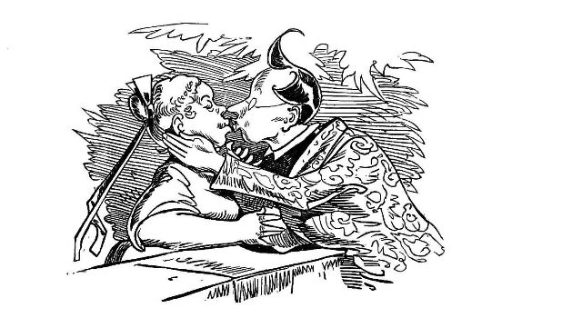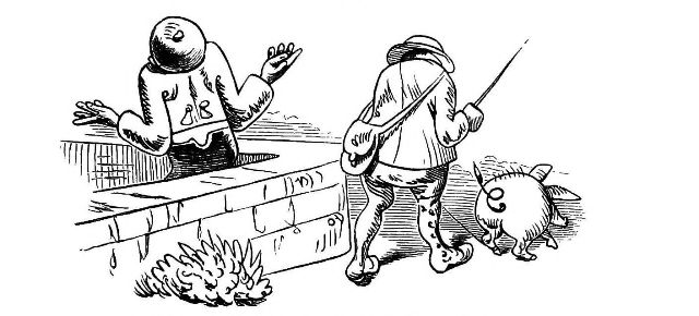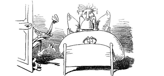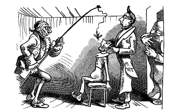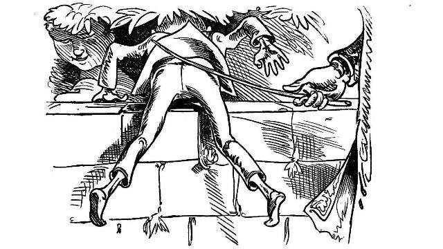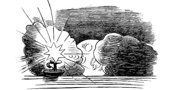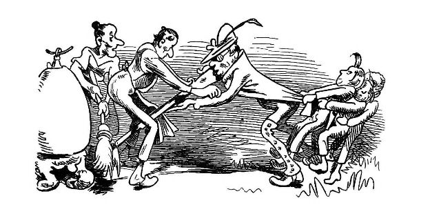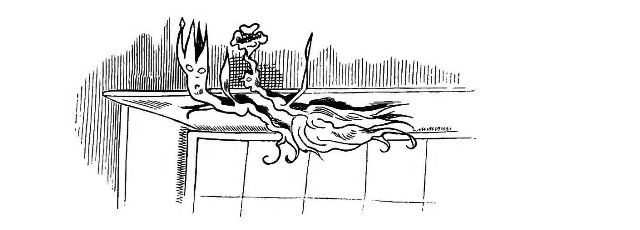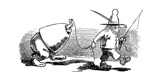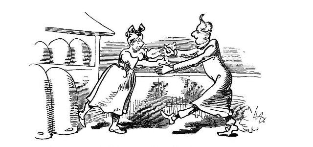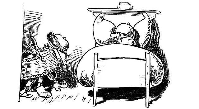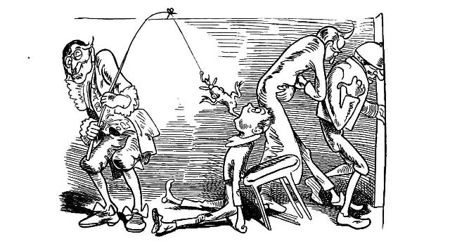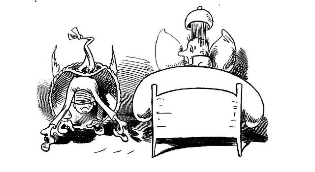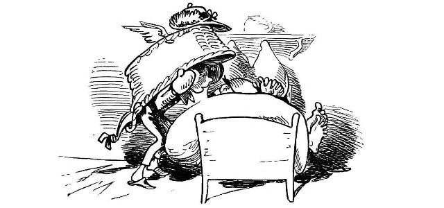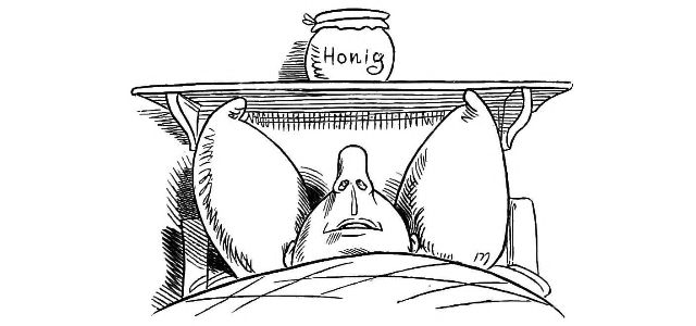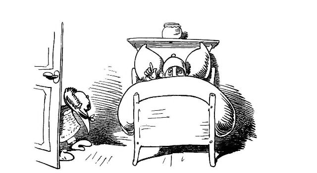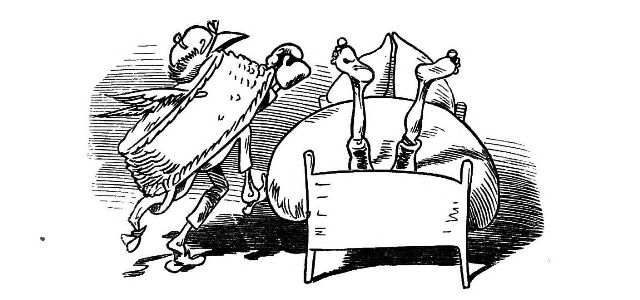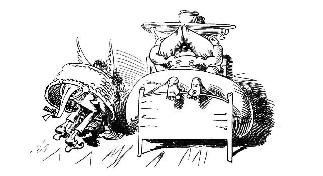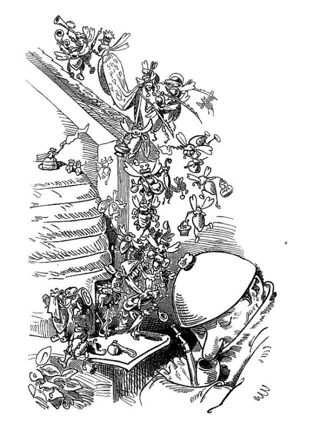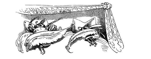The Honey Pot.—Page 47-52.—This Fytte, comical as it is in itself, is particularly valuable as instructing the untravelled Britisher in the peculiarities of a German bedstead; far too short for all who have not by some Procrustœan process been reduced to the normal height of five feet, no inches! the upper sheet sown to the coverlid, with no possibility of tucking it in, and liable to fall off the sleeper altogether. No blankets, but a mountain of feather-bed piled above, which either stifles you in summer, or rolling off, leaves you to freeze in the winter. Yet in such a bed as this what wonderful positions Mr. Dull managed to assume under the influence of fear. Imitate him, my gentle reader, if you are still young and active, and then you will appreciate his contortions.[Pg 81]