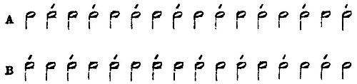 This diagram represents the separate beats by notes, and the accent shows those beats that are subjectively emphasised. Row A shows an ascending beat, and row B a descending one. Now if it happens that we can at will hear into the beats of the metronome an ascending or a descending beat (A or B), i.e. we can hear one and the same beat now emphasised and now unemphasised, then we may regard the instrument as suitable for all the psychological experiments to be described in the following pages.