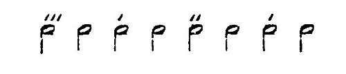 The scope of consciousness, in accordance with our definition, is a relatively constant value, if we keep to a special time, e.g. the 2⁄8 time. It does not change with a different rapidity of beat within the above-mentioned limits. A change in the time, however, exercises great influence. Such a change is to some extent dependent upon our will. We can hear into our uniform row of beats not only a simple 2⁄8 time, but a more complicated rhythm, e.g. the following 4⁄4 time:—