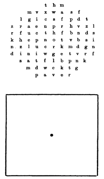 Although these observations as to the simultaneous recognition of haphazardly arranged simple objects, e.g. letters, point decisively to a fairly narrow limitation of the scope of attention, still we cannot give an exact numerical answer by this method as to the size of this scope, as we could by means of our metronome experiments in regard to the scope of consciousness. Still, without any great change and without any complicated apparatus, we can make these visual experiments suffice to answer our question. Our immediate results will, of course, only be valid under the special conditions we set up. For this purpose a great number of such diagrams, with letters arranged in the same manner, must be constructed. The position of the letters in each diagram must be different. Then a fairly large square of white cardboard, with a black point in the middle, is made (as in the figure on p. 19). With this we cover the diagram chosen for the experiment. The observer, who previously must not have seen the diagrams, is told to fixate with one eye the point in the middle, and to keep the other eye closed.