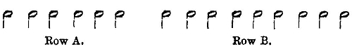 Let us now, equipped with the results of our visual experiments, turn our attention again to our metronome experiments. The analogy between the two immediately gives rise to this question: Can we not in our rhythm experiments arrange the conditions so that we may obtain a similar isolation of simple impressions, as was necessary in measuring the scope of attention for the sense of sight? Now in fact such an isolation of single beats arises at once, as soon as we restrain a "hearing into" the beats of any kind of accentuation whatever. Even the simplest rhythm, the 2/8 time, must be avoided. This is not so easy as it appears to be at the first glance, because of the rhythmical disposition of our consciousness and of our whole psycho-physical organisation. Again and again we are inclined to hear into a row of beats following each other at similar intervals, at least the 2/8 time. And yet it is possible to conform to this condition, if the metronome beats do not show any noticeable objective differences. The interval between the beats must be chosen long enough to check any tendency to rhythmical grouping, and yet not too long, so that it may still remain possible to grasp so many beats as one whole. In general an interval of from 1 1/2-2 1/2 seconds will conform to this requirement. With such an interval, after a fair amount of practice, it is possible to change at will from a rhythmical to an unrhythmical or absolutely monotonous perception of the beats. If this is done, and if in exactly the same manner as in the rhythm experiments a number of metronome beats is given, and then after a pause the same or a slightly differing number is given, the observer can clearly perceive the identity or difference of the two rows. If in the first test a row of six beats is given (row A), and in the second a row of nine, it appears in repeating two rows of the same length, that a precise recognition of identity is present with row A, whereas with row B this is impossible. Even with seven or eight beats recognition is very uncertain. We arrive therefore at the same result as in our optical experiments. Six simple impressions form the limit for the scope of attention.