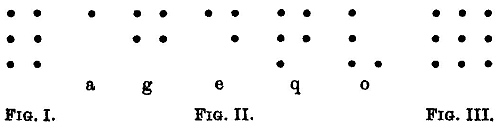 There still remains another phenomenon that coincides with this result. It is the more worthy of note since it belongs to a third sense, namely the sense of touch, and since it was discovered from practical considerations quite independent of psychology. There had been many futile attempts to discover the most useful method of printing for the blind, before Braille, a French teacher of the blind, about the middle of last century solved this important practical problem. He himself had become blind, and was therefore in a better position than others to make sure of the requirements that were necessary, by means of experiments upon himself. He came to this result, that, first of all, groups of distinct points were the only suitable means of establishing letter-signs that could be easily distinguished, and that, secondly, not more than six definite points were to be used for one letter. These points must not spread over an extent greater than that which can be covered by the sense of touch, if the symbols are to be distinguished by the fingers of the blind with ease and certainty. He decided for an arrangement of points as seen in Fig. I., out of which the alphabet for the blind was arranged:—
